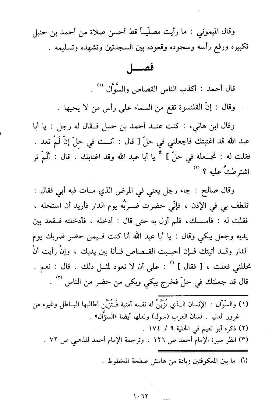 قَالَ أَحْمَدُ: أَكْذَبُ النَّاسِ الْقَصَّاصُ وَالسَّوَّالُ.