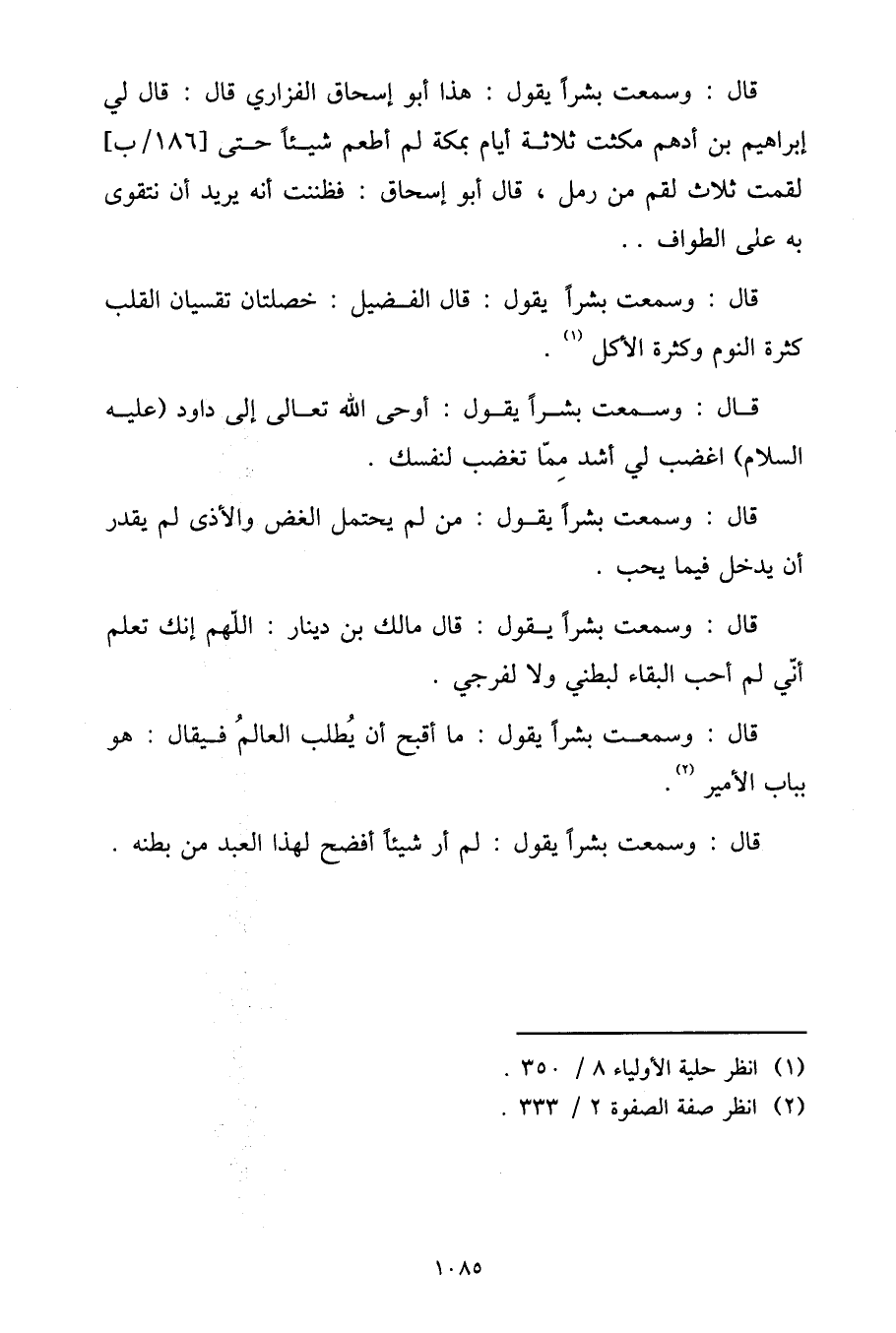 قَالَ: وَسَمِعْتُ بِشْرًا , يَقُولُ: قَالَ الْفُضَيْلُ: خَصْلَتَانِ تُقَسِّيَانِ الْقَلْبَ: كَثْرَةُ النَّوْمِ , وَكَثْرَةُ الْأَكْلِ