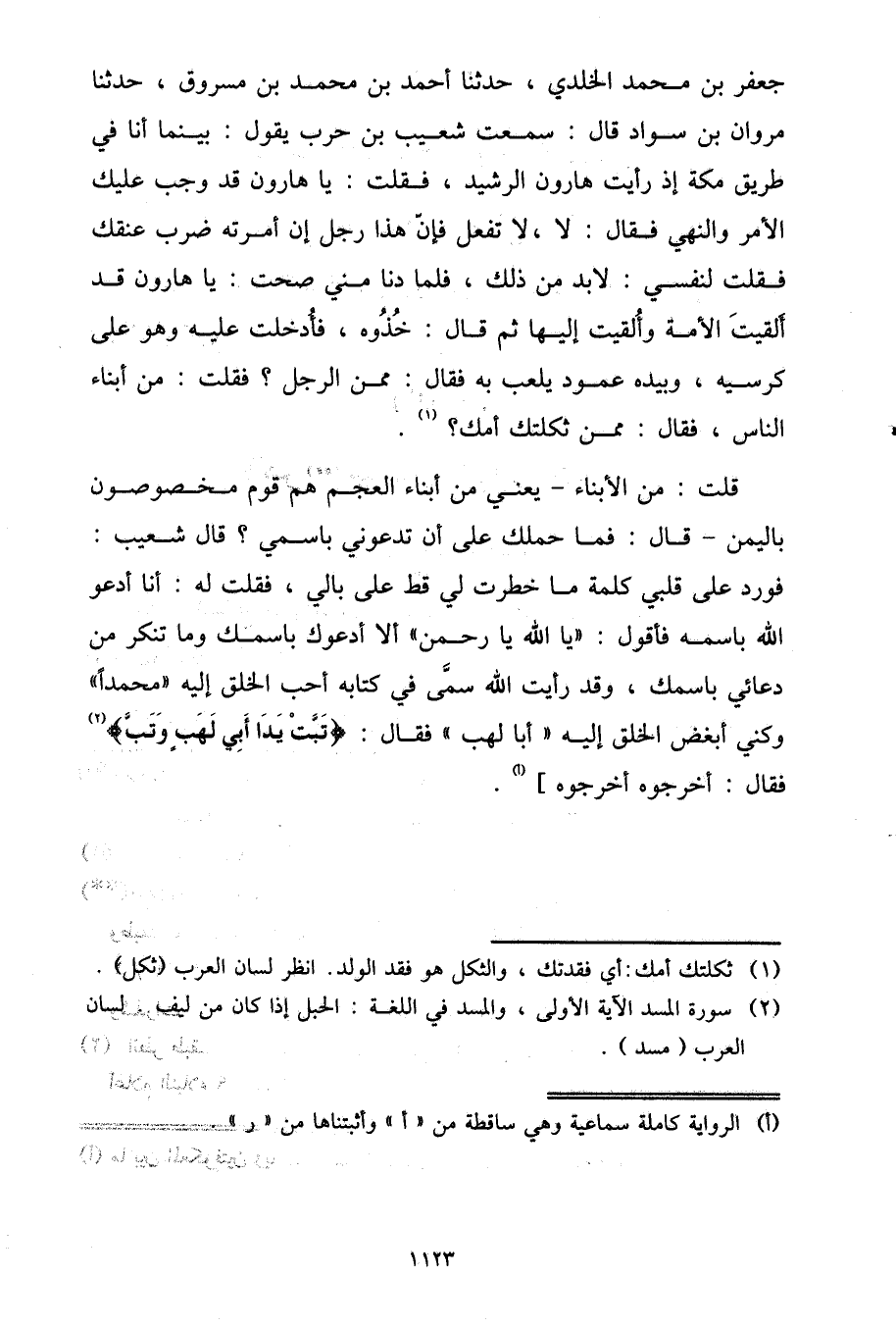 جَعْفَرُ بْنُ مُحَمَّدٍ الْخُلْدِيُّ، حَدَّثَنَا أَحْمَدُ بْنُ مُحَمَّدِ بْنِ مَسْرُوقٍ، حَدَّثَنَا مَرْوَانُ بْنُ سَوَادٍ، قَالَ: سَمِعْتُ شُعَيْبَ بْنَ حَرْبٍ، يَقُولُ: " بَيْنَمَا أَنَا فِي طَرِيقِ مَكَّةَ إِذْ رَأَيْتُ هَارُونَ الرَّشِيدَ، فَقُلْتُ: يَا هَارُونُ، قَدْ وَجَبَ عَلَيْكَ الْأَمْرُ وَالنَّهْيُ فَقَالَ: لَا، لَا تَفْعَلْ إِنَّ هَذَا رَجُلٌ إِنْ أَمَرْتَهُ ضَرَبَ عُنُقَكَ، فَقُلْتُ لِنَفْسِي: لَابُدَّ مِنْ ذَلِكَ، فَلَمَّا دَنَا مِنِّي صِحْتُ: يَا هَارُونُ، قَدْ أَلْقَيْتَ الْأُمَّةَ وَأُلْقِيتَ إِلَيْهَا، ثُمَّ قَالَ: خُذُوهُ، فَأُدْخِلْتُ عَلَيْهِ وَهُوَ عَلَى كُرْسِيِّهِ، وَبِيَدِهِ عَمُودٌ يَلْعَبُ بِهِ، فَقَالَ: مِمَّنِ الرَّجُلُ؟ فَقُلْتُ: مِنْ أَبْنَاءِ النَّاسِ، فَقَالَ: مِمَّنْ ثَكِلَتْكَ أُمُّكَ؟ قُلْتُ: مِنَ الْأَبْنَاءِ، يَعْنِي مِنْ أَبْنَاءِ الْعَجَمِ هُمْ قَوْمٌ مُخَصَّصُّونَ بِالْيَمَنِ، قَالَ: فَمَا حَمَلَكَ عَلَى أَنْ تَدْعُوَنِي بِاسْمِي؟ قَالَ شُعَيْبٌ: فَوَرَدَ عَلَى قَلْبِي كَلِمَةٌ مَا خَطَرَتْ لِي قَطُّ عَلَى بَالِي، فَقُلْتُ لَهُ: أَنَا أَدْعُو اللَّهَ بِاسْمِهِ فَأَقُولُ: يَا اللَّهُ، يَا رَحْمَنُ، أَلَا أَدْعُوكَ بِاسْمِكَ، وَمَا تُنْكِرُ مِنْ دُعَائِي بِاسْمِكَ، وَقَدْ رَأَيْتَ اللَّهَ سَمَّى فِي كِتَابِهِ أَحَبَّ الْخَلْقِ إِلَيْهِ مُحَمَّدًا، وَكَنَّى أَبْغَضَ الْخَلْقِ إِلَيْهِ أَبَا لَهَبٍ فَقَالَ: {تَبَّتْ يَدَا أَبِي لَهَبٍ وَتَبَّ} [المسد: ١] .