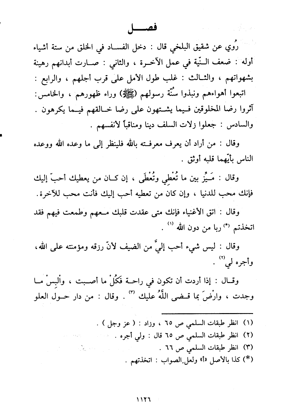 رُوِيَ عَنْ شَقِيقٍ الْبَلْخِيِّ , قَالَ: دَخَلَ الْفَسَادُ فِي الْخَلْقِ مِنْ سِتَّةِ أَشْيَاءَ: أَوَّلُهُ: ضَعْفُ النِّيَّةِ فِي عَمَلِ الْآخِرَةِ، وَالثَّانِي: صَارَتْ أَبْدَانُهُمْ رَهِينَةً بِشَهَوَاتِهِمْ، وَالثَّالِثُ: غَلَبُ طُولِ الْأَمَلِ عَلَى قُرْبِ أَجَلِهِمْ، وَالرَّابِعُ: اتَّبَعُوا أَهْوَاءَهُمْ وَنَبَذُوا سُنَّةَ رَسُولِهِمْ صَلَّى اللَّهُ عَلَيْهِ وَسَلَّمَ وَرَاءَ ظُهُورِهِمْ، وَالْخَامِسُ: آثَرُوا رِضَا الْمَخْلُوقِينَ فِيمَا يَشْتَهُونَ عَلَى رِضَا خَالِقِهِمْ فِيمَا يَكْرَهُونَ، وَالسَّادِسُ: جَعَلُوا زَلَّاتِ السَّلَفِ دِينًا وَمَنَاقِبًا لِأَنْفُسِهِمْ.