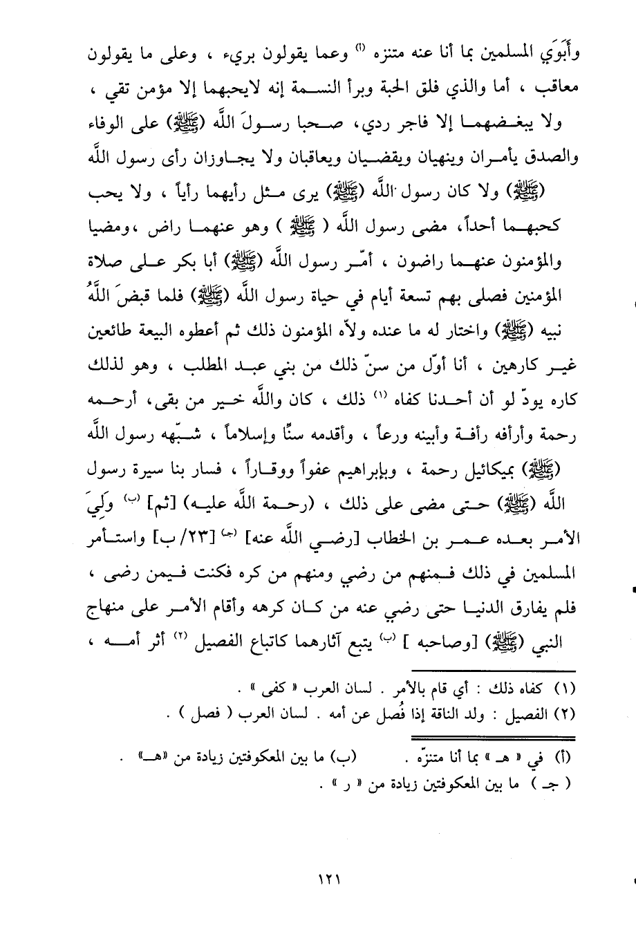 وَأَبَوَيِ الْمُسْلِمِينَ بِمَا أَنَا عَنْهُ مُتَنَزِّهٌ وَعَمَّا يَقُولُونَ بَرِيءٌ، وَعَلَى مَا يَقُولُونَ مُعَاقِبٌ، أَمَا وَالَّذِي فَلَقَ الْحَبَّةَ وَبَرَأَ النَّسَمَةَ إِنَّهُ لَا يُحِبُّهُمَا إِلَّا مُؤْمِنٌ تَقِيٌّ، وَلَا يَبُغِضُهُمَا إِلَّا فَاجِرٌ رَدِيٌّ، صَحِبَا رَسُولَ اللَّهِ صَلَّى اللَّهُ عَلَيْهِ وَسَلَّمَ عَلَى الْوَفَاءِ وَالصِّدْقِ يَأْمُرَانِ، وَيَنْهَيَانِ، وَيَقْضِيَانِ، وَيُعَاقِبَانِ، وَلَا يُجَاوِزَانِ رَأْيَ رَسُولِ اللَّهِ صَلَّى اللَّهُ عَلَيْهِ وَسَلَّمَ، وَلَا كَانَ رَسُولُ اللَّهِ صَلَّى اللَّهُ عَلَيْهِ وَسَلَّمَ يَرَى مِثْلَ رَأْيِهِمَا رَأْيًا، وَلَا يُحِبُّ كَحُبِّهِمَا أَحَدًا، مَضَى رَسُولُ اللَّهِ صَلَّى اللَّهُ عَلَيْهِ وَسَلَّمَ وَهُوَ عَنْهُمَا رَاضٍ، وَمَضَيَا وَالْمُؤْمِنُونَ عَنْهُمَا رَاضُونَ، أَمَّرَ رَسُولُ اللَّهِ صَلَّى اللَّهُ عَلَيْهِ وَسَلَّمَ أَبَا بَكْرٍ عَلَى صَلَاةِ الْمُؤْمِنِينَ فَصَلَّى بِهِمْ تِسْعَةَ أَيَّامٍ فِي حَيَاةِ رَسُولِ اللَّهِ صَلَّى اللَّهُ عَلَيْهِ وَسَلَّمَ، فَلَمَّا قَبَضَ اللَّهُ نَبِيَّهُ صَلَّى اللَّهُ عَلَيْهِ وَسَلَّمَ، وَاخْتَارَ لَهُ مَا عِنْدَهُ وَلَّاهُ الْمُؤْمِنُونَ ذَلِكَ، ثُمَّ أَعْطَوْهُ الْبَيْعَةَ طَائِعِينَ غَيْرَ كَارِهِينَ، أَنَا أَوَّلُ مَنْ سَنَّ ذَلِكَ مِنْ بَنِي عَبْدِ الْمُطَّلِبِ، وَهُوَ لِذَلِكَ كَارِهٌ يَوَدُّ لَوْ أَنَّ أَحَدَنَا كَفَاهُ ذَلِكَ، كَانَ وَاللَّهِ خَيْرَ مَنْ بَقِيَ، أَرْحَمَهُ رَحْمَةً وَأَرْأَفَهُ وَأَبْيَنَهُ وَرَعًا، وَأَقْدَمَهُ سِنًّا وَإِسْلَامًا، شَبَّهَهُ رَسُولُ اللَّهِ صَلَّى اللَّهُ عَلَيْهِ وَسَلَّمَ بِمِيكَائِيلَ رَحْمَةً، وَبِإِبْرَاهِيمَ عَفْوًا وَوَقَارًا، فَسَارَ بِنَا سِيرَةَ رَسُولِ اللَّهِ صَلَّى اللَّهُ عَلَيْهِ وَسَلَّمَ حَتَّى مَضَى عَلَى ذَلِكَ، رَحْمَةُ اللَّهِ عَلَيْهِ، ثُمَّ وَلِيَ الْأَمْرَ بَعْدَهُ عُمَرُ بْنُ الْخَطَّابِ رَضِيَ اللَّهُ عَنْهُ، وَاسْتَأْمَرَ الْمُسْلِمِينَ فِي ذَلِكَ، فَمِنْهُمْ مَنْ رَضِيَ، وَمِنْهُمْ مَنْ كَرِهَ، فَكُنْتُ فِيمَنْ رَضِيَ، فَلَمْ يُفَارِقِ الدُّنْيَا حَتَّى رَضِيَ عَنْهُ مَنْ كَانَ كَرِهَهُ، وَأَقَامَ الْأَمْرَ عَلَى مِنْهَاجِ النَّبِيِّ صَلَّى اللَّهُ عَلَيْهِ وَسَلَّمَ وَصَاحِبِهِ يَتَّبِعُ آثَارَهُمَا كَاتِّبَاعِ الْفَصِيلِ أَثَرَ أُمِّهِ،