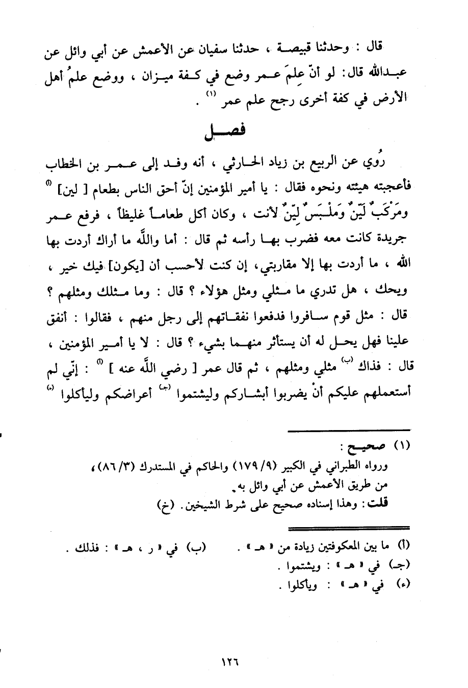فَهَلْ يَحِلُّ لَهُ أَنْ يَسْتَأْثِرَ مِنْهُمَا بِشَيْءٍ؟ قَالَ: لَا يَا أَمِيرَ الْمُؤْمِنِينَ، قَالَ: فَذَاكَ مَثَلِي وَمَثَلُهُمْ، ثُمَّ قَالَ عُمَرُ رَضِيَ اللَّهُ عَنْهُ: إِنِّي لَمْ أَسْتَعْمِلْهُمْ عَلَيْكُمْ أَنْ يَضْرِبُوا أَبْشَارَكُمْ وَلِيَشْتِمُوا أَعْرَاضَكُمْ وَلِيَأْكُلُوا