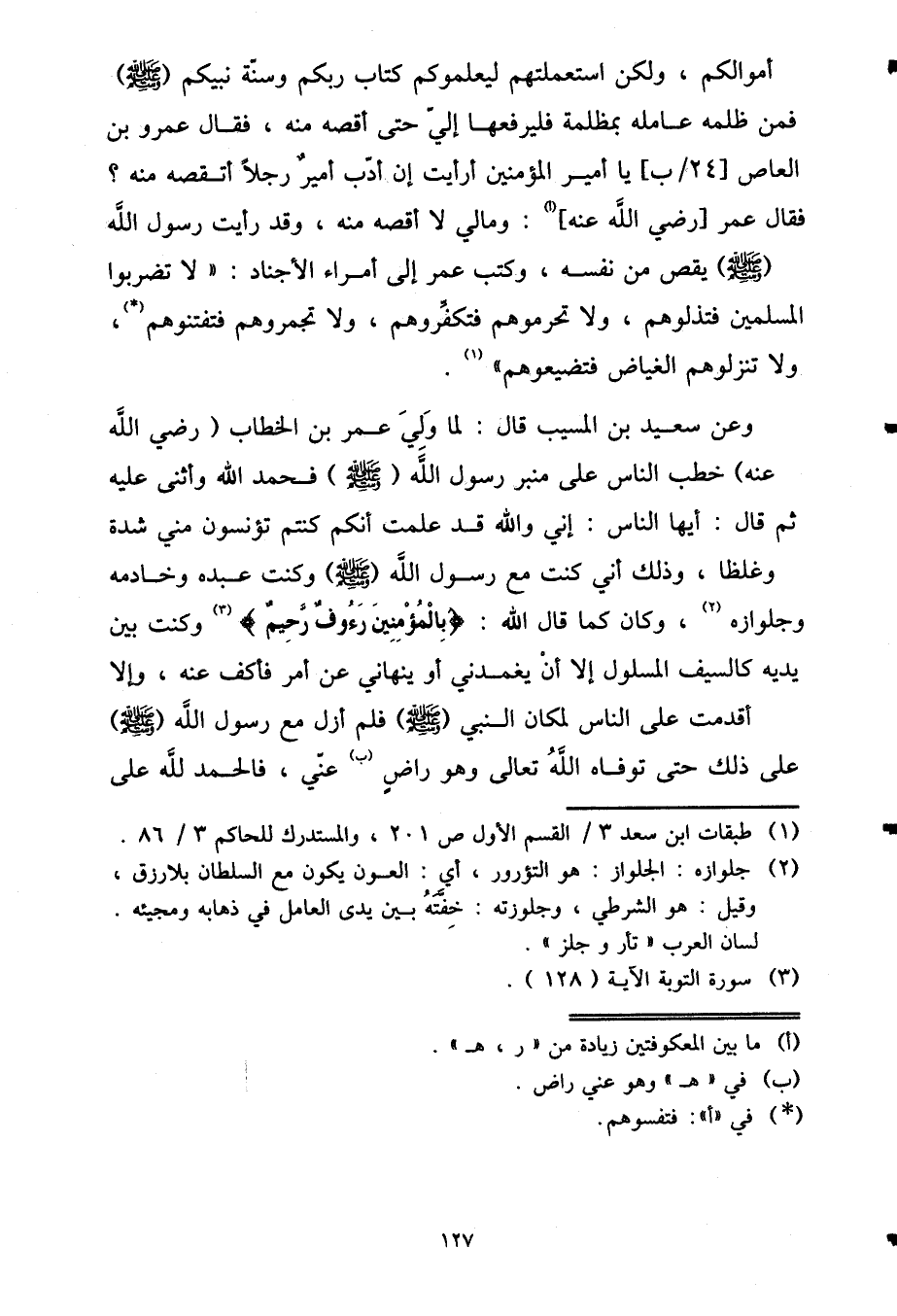 أَمْوَالَكُمْ، وَلَكِنِ اسْتَعْمَلْتُهُمْ لِيُعَلِّمُوكُمْ كِتَابَ رَبِّكُمْ، وَسُنَّةَ نَبِيِّكُمْ صَلَّى اللَّهُ عَلَيْهِ وَسَلَّمَ، فَمَنْ ظَلَمَهُ عَامِلُهُ بِمَظْلَمَةٍ فَلْيَرْفَعْهَا إِلَيَّ حَتَّى أَقُصَّهُ مِنْهُ، فَقَالَ عَمْرُو بْنُ الْعَاصِ يَا أَمِيرَ الْمُؤْمِنِينَ: أَرَأَيْتَ إِنْ أَدَّبَ أَمِيرٌ رَجُلًا أَتَقُصُّهُ مِنْهُ؟ فَقَالَ عُمَرُ رَضِيَ اللَّهُ عَنْهُ: وَمَالِي لَا أَقُصُّهُ مِنْهُ، وَقَدْ رَأَيْتُ رَسُولَ اللَّهِ صَلَّى اللَّهُ عَلَيْهِ وَسَلَّمَ يَقُصُّ مِنْ نَفْسِهِ، وَكَتَبَ عُمَرُ إِلَى أُمَرَاءِ الْأَجْنَادِ: «لَا تَضْرِبُوا الْمُسْلِمِينَ فَتُذِلُّوهُمْ، وَلَا تَحْرِمُوهُمْ فَتُكَفِّرُوهُمْ، وَلَا تُجَمِّرُوهُمْ فَتَفْتِنُوهُمْ، وَلَا تُنْزِلُوهُمُ الْغِيَاضَ فَتُضَيِّعُوهُمْ» وَعَنْ سَعِيدِ بْنِ الْمُسَيِّبِ، قَالَ: لَمَّا وَلِيَ عُمَرُ بْنُ الْخَطَّابِ رَضِيَ اللَّهُ عَنْهُ، خَطَبَ النَّاسَ عَلَى مِنْبَرِ رَسُولِ اللَّهِ صَلَّى اللَّهُ عَلَيْهِ وَسَلَّمَ، فَحَمِدَ اللَّهَ، وَأَثْنَى عَلَيْهِ، ثُمَّ قَالَ: أَيُّهَا النَّاسُ: إِنِّي وَاللَّهِ قَدْ عَلِمْتُ أَنَّكُمْ كُنْتُمْ تُؤْنِسُونَ مِنِّي شِدَّةً وَغِلَظًا، وَذَلِكَ أَنِّي كُنْتُ مَعَ رَسُولِ اللَّهِ صَلَّى اللَّهُ عَلَيْهِ وَسَلَّمَ، وَكُنْتُ عَبْدَهُ وَخَادِمَهُ وَجِلْوَازَهُ، وَكَانَ كَمَا قَالَ اللَّهُ: {بِالْمُؤْمِنِينَ رَءُوفٌ رَحِيمٌ} [التوبة: ١٢٨] وَكُنْتُ بَيْنَ يَدَيْهِ كَالسَّيْفِ الْمَسْلُولِ إِلَّا أَنْ يَغْمِدَنِي أَوْ يَنْهَانِي عَنْ أَمْرٍ فَأَكُفُّ عَنْهُ، وَإِلَّا أَقْدَمْتُ عَلَى النَّاسِ لِمَكَانِ النَّبِيِّ صَلَّى اللَّهُ عَلَيْهِ وَسَلَّمَ فَلَمْ أَزَلْ مَعَ رَسُولِ اللَّهِ صَلَّى اللَّهُ عَلَيْهِ وَسَلَّمَ عَلَى ذَلِكَ حَتَّى تَوَفَّاهُ اللَّهُ تَعَالَى وَهُوَ رَاضٍ عَنِّي، فَالْحَمْدُ لِلَّهِ عَلَى