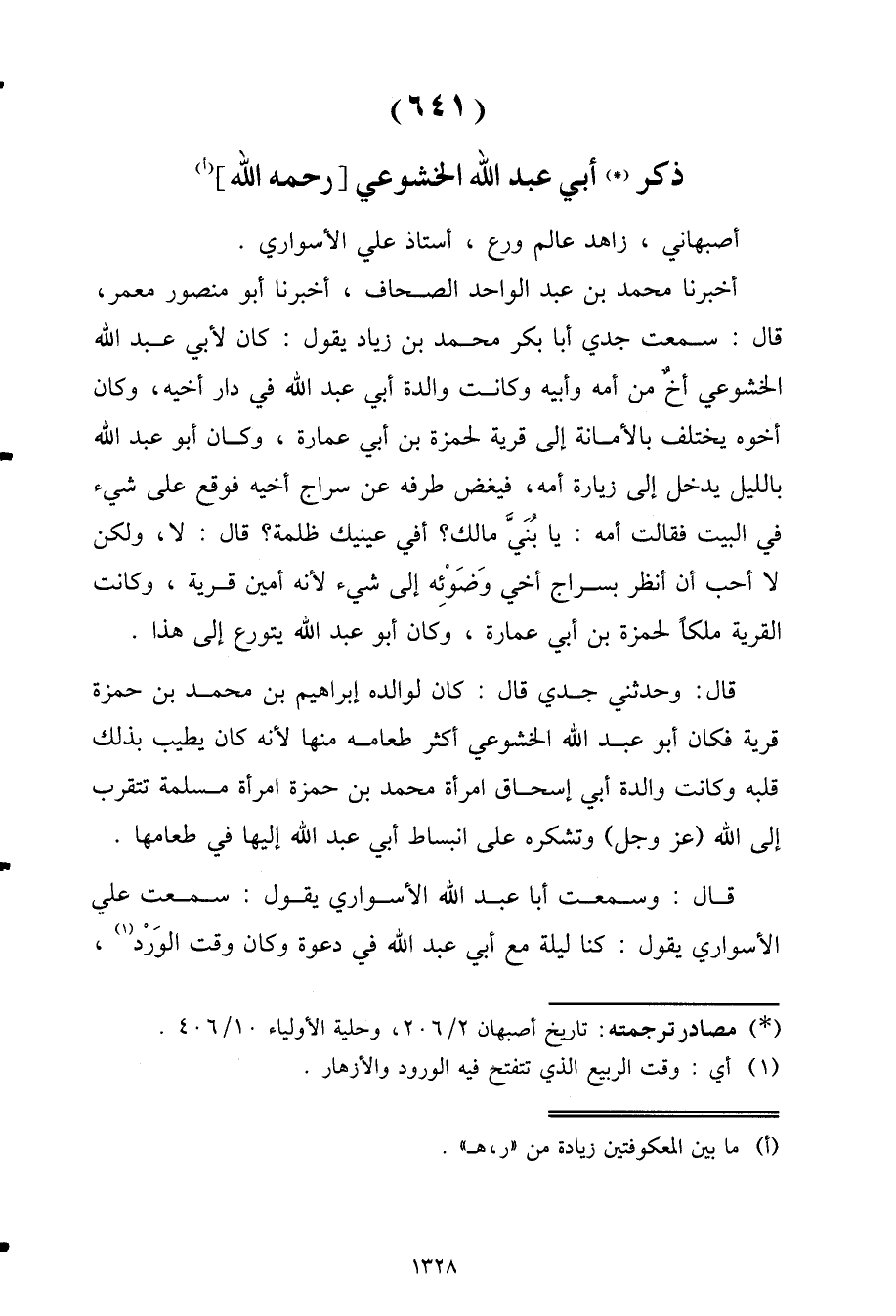 أَخْبَرَنَا مُحَمَّدُ بْنُ عَبْدِ الْوَاحِدِ الصَّحَّافُ، أَخْبَرَنَا أَبُو مَنْصُورٍ مَعْمَرٌ، قَالَ: سَمِعْتُ جَدِّي أَبَا بَكْرٍ مُحَمَّدَ بْنَ زِيَادٍ يَقُولُ: كَانَ لِأَبِي عَبْدِ اللَّهِ الْخُشُوعِيِّ أَخٌ مِنْ أُمِّهِ وَأَبِيهِ وَكَانَتْ وَالِدَةُ أَبِي عَبْدِ اللَّهِ فِي دَارِ أَخِيهِ، وَكَانَ أَخُوهُ يُخْتَلَفُ بِالْأَمَانَةِ إِلَى قَرْيَةٍ لِحَمْزَةَ بْنِ أَبِي عُمَارَةَ، وَكَانَ أَبُو عَبْدِ اللَّهِ بِاللَّيْلِ يَدّخُلُ إِلَى زِيَارَةِ أُمِّهِ، فَيَغُضُّ طَرْفَهُ عَنْ سِرَاجِ أَخِيهِ، فَوَقَعَ عَلَى شَيْءٍ فِي الْبَيْتِ فَقَالَتْ أُمُّهُ: يَا بُنَيَّ مَالَكَ؟ أَفِي عَيْنَيْكَ ظُلْمَةٌ؟ قَالَ: لَا، وَلَكِنْ لَا أُحِبُّ أَنْ أَنْظُرَ بِسِرَاجِ أَخِي وَضَوْئِهِ إِلَى شَيْءٍ لِأَنَّهُ أَمِينُ قَرْيَةٍ، وَكَانَتِ الْقَرْيَةُ مِلْكًا لِحَمْزَةَ بْنِ أَبِي عُمَارَةَ، وَكَانَ أَبُو عَبْدِ اللَّهِ يَتَوَرَّعُ إِلَى هَذَا.