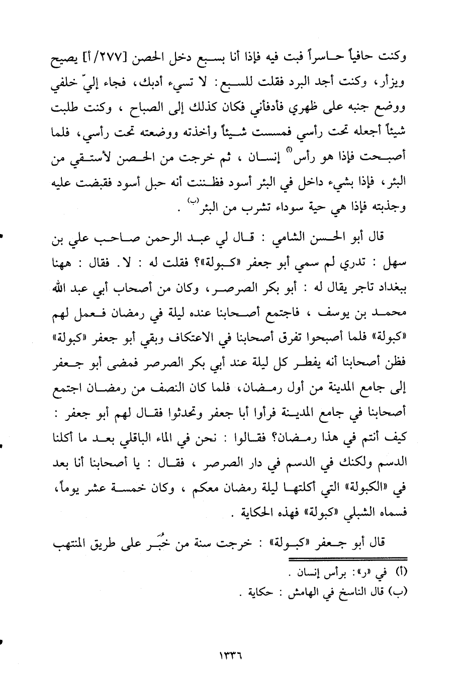 فَقَالَ: هَهُنَا بِبَغْدَادَ تَاجِرٌ، يُقَالُ لَهُ: أَبُو بَكْرٍ الصَّرْصَرُ، وَكَانَ مِنْ أَصْحَابِ أَبِي عَبْدِ اللَّهِ مُحَمَّدِ بْنِ يُوسُفَ، فَاجْتَمَعَ أَصْحَابُنَا عِنْدَهُ لَيْلَةً فِي رَمَضَانَ فَعَمَلَ لَهُمْ كَبْوَلَةَ، فَلَمَّا أَصْبَحُوا تَفَرَّقَ أَصْحَابُنَا فِي الاعْتِكَافِ وَبَقِيَ أَبُو جَعْفَرٍ كَبْوَلَةُ، فَظَنَّ أَصْحَابُنَا أَنَّهُ يَفْطِرُ كُلَّ لَيْلَةٍ عِنْدَ أَبِي بَكْرٍ الصَّرْصَرِ فَمَضَى أَبُو جَعْفَرٍ إِلَى جَامِعِ الْمَدِينَةِ مِنْ أَوَّلِ رَمَضَانَ، فَلَمَّا كَانَ النِّصْفُ مِنْ رَمَضَانَ اجْتَمَعَ أَصْحَابُنَا فِي جَامِعِ الْمَدِينَةِ، فَرَأَوْا أَبَا جَعْفَرٍ وَتَحَدَّثُوا، فَقَالَ لَهُمْ أَبُو جَعْفَرٍ: كَيْفَ أَنْتُمْ فِي هَذَا رَمَضَانَ؟ فَقَالُوا: نَحْنُ فِي الْمَاءِ الْبَاقِلِّيِّ بَعْدَ مَا أَكَلْنَا الدَّسَمَ وَلَكِنَّكَ فِي الدَّسَمِ فِي دَارِ الصَّرْصَرِ، فَقَالَ: يَا أَصْحَابَنَا أَنَا بَعْدُ فِي الْكَبْوَلَةِ الَّتِي أَكَلْتُهَا لَيْلَةَ رَمَضَانَ مَعَكُمْ وَكَانَ خَمْسَةَ عَشَرَ يَوْمًا، فَسَمَّاهُ الشِّبْلِيُّ كَبْوَلَةَ، فَهَذِهِ الْحِكَايَةُ.