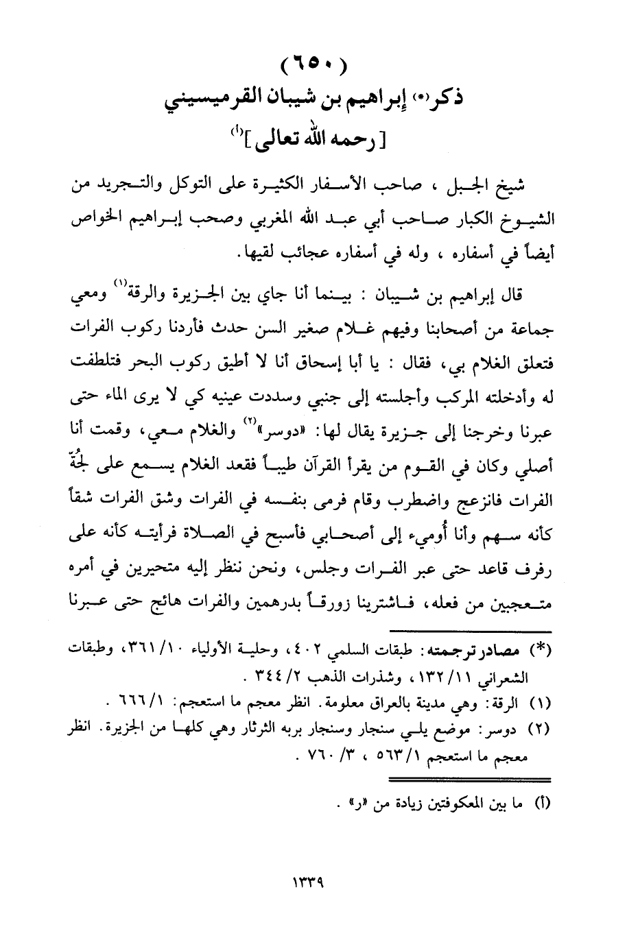 قَالَ إِبْرَاهِيمُ بْنُ شَيْبَانَ: بَيْنَمَا أَنَا جَاي بَيْنَ الْجَزِيرَةِ وَالرَّقَّةِ وَمَعِي جَمَاعَةٌ مِنْ أَصْحَابِنَا وَفِيهِمْ غُلَامٌ صَغِيرُ السِّنِّ حَدَثٌ، فَأَرَدْنَا رُكُوبَ الْفُرَاتِ فَتَعَلَّقَ الْغُلَامُ بِي، فَقَالَ: يَا أَبَا إِسْحَاقَ أَنَا لَا أُطِيقُ رُكُوبَ الْبَحْرِ فَتَلَطَّفْتُ لَهُ وَأَدْخَلْتُهُ الْمَرْكَبَ وَأَجْلَسْتُهُ إِلَى جَنْبِي وَسَدَدْتُ عَيْنَيْهِ كِي لَا يَرَى الْمَاءَ حَتَّى عَبَرْنَا وَخَرَجْنَا إِلَى جَزِيرَةٍ يُقَالُ لَهَا: دَوْسَرُ، وَالْغُلَامُ مَعِي، وَقُمْتُ أَنَا أُصَلِّي وَكَانَ فِي الْقَوْمِ مَنْ يَقْرَأُ الْقُرْآنَ طَيِّبًا فَقَعَدَ الْغُلَامُ يَسْمَعُ عَلَى لُجَّةِ الْفُرَاتِ، فَانْزَعَجَ وَاضْطَرَبَ وَقَامَ فَرَمَى بِنَفْسِهِ فِي الْفُرَاتِ وَشَقَّ الْفُرَاتَ شَقًّا كَأَنَّهُ سَهْمٌ وَأَنَا أُومِئُ إِلَى أَصْحَابِي، فَأُسَبِّحُ فِي الصَّلَاةِ، فَرَأَيْتُهُ كَأَنَّهُ عَلَى رَفْرَفٍ قَاعِدٌ، حَتَّى عَبَرَ الْفُرَاتَ وَجَلَسَ، وَنَحْنُ نَنْظُرُ إِلَيْهِ مُتَحَيِّرِينَ فِي أَمْرِهِ مُتَعَجِّبِينَ مِنْ فِعْلِهِ، فَاشْتَرَيْنَا زَوْرَقًا بِدِرْهَمَيْنِ، وَالْفُرَاتُ هَائِجٌ حَتَّى عَبَرْنَا
