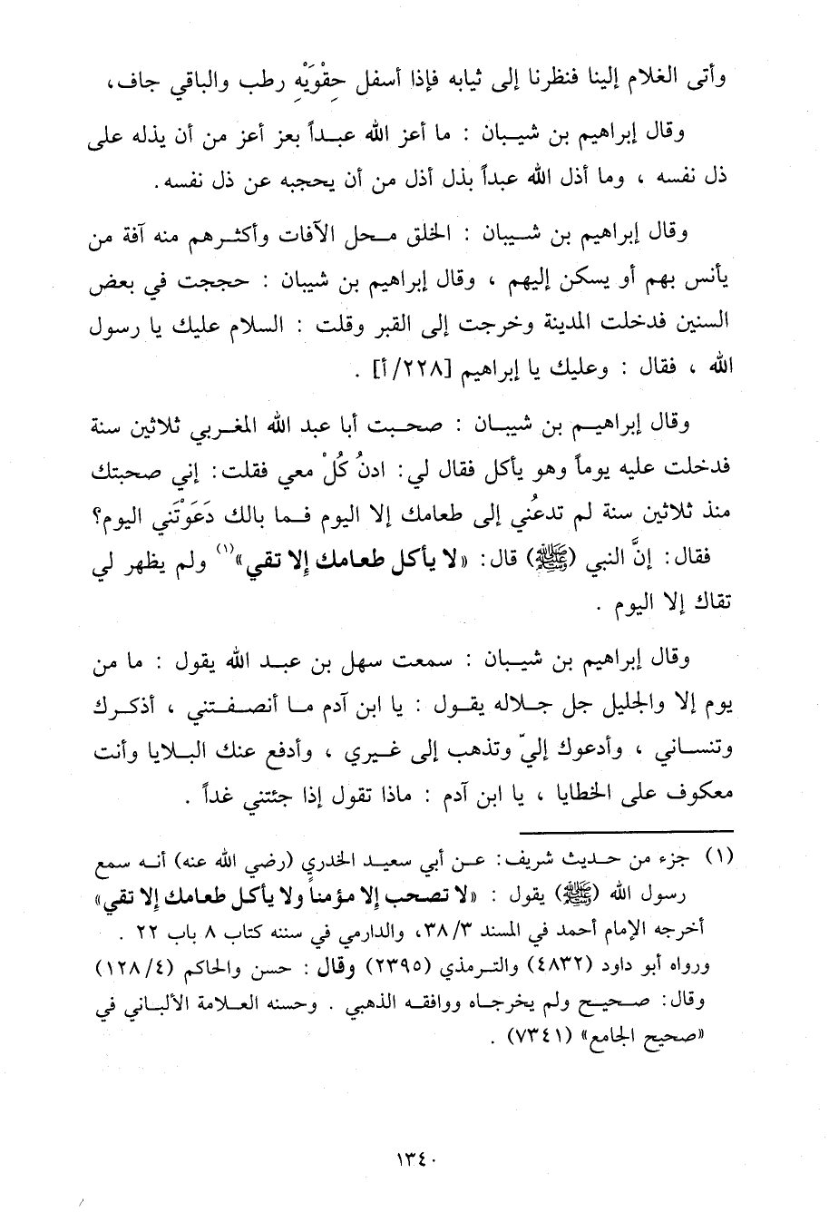 وَقَالَ إِبْرَاهِيمُ بْنُ شَيْبَانَ: صَحِبْتُ أَبَا عَبْدِ اللَّهِ الْمَغْرِبِيَّ ثَلَاثِينَ سَنَةً، فَدَخَلْتُ عَلَيْهِ يَوْمًا وَهُوَ يَأْكُلُ فَقَالَ لِي: ادْنُ كُلْ مَعِي، فَقُلْتُ: إِنِّي صَحِبْتُكَ مُنْذُ ثَلَاثِينَ سَنَةً لَمْ تَدْعُنِي إِلَى طَعَامَكَ إِلَّا الْيَوْمَ، فَمَا بَالُكَ دَعَوْتَنِي الْيَوْمَ؟ فَقَالَ: إِنَّ النَّبِيَّ صَلَّى اللَّهُ عَلَيْهِ وَسَلَّمَ، قَالَ: «لَا يَأْكُلُ طَعَامَكَ إِلَّا تَقِيٌّ» وَلَمْ يَظْهَرْ لِي تُقَاكَ إِلَّا الْيَوْمَ وَقَالَ إِبْرَاهِيمُ بْنُ شَيْبَانَ: سَمِعْتُ سَهْلَ بْنَ عَبْدِ اللَّهِ يَقُولُ: مَا مِنْ يَوْمٍ إِلَّا وَالْجَلِيلُ جَلَّ جَلَالُهُ يَقُولُ: يَا ابْنَ آدَمَ مَا أَنْصَفْتَنِي، أَذْكُرُكَ وَتَنْسَانِي، وَأَدْعُوكَ إِلَيَّ وَتَذْهَبُ إِلَى غَيْرِي، وَأَدْفَعُ عَنْكَ الْبَلَايَا وَأَنْتَ مَعْكُوفٌ عَلَى الْخَطَايَا، يَا ابْنَ آدَمَ: مَاذَا تَقُولُ إِذَا جِئْتَنِي غَدًا؟