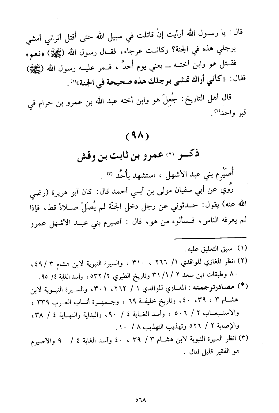 قَالَ: يَا رَسُولَ اللَّهِ، أَرَأَيْتَ إِنْ قَاتَلْتُ فِي سَبِيلِ اللَّهِ حَتَّى أُقْتَلَ أَتُرَانِي أَمْشِي بِرِجْلِي هَذِهِ فِي الْجَنَّةِ؟ وَكَانَتْ عَرْجَاءَ، فَقَالَ رَسُولُ اللَّهِ صَلَّى اللَّهُ عَلَيْهِ وَسَلَّمَ: «نَعَمْ» ، فَقُتِلَ هُوَ وَابْنُ أُخْتِهِ، يَعْنِي يَوْمَ أُحُدٍ، فَمَرَّ عَلَيْهِ رَسُولُ اللَّهِ صَلَّى اللَّهُ عَلَيْهِ وَسَلَّمَ فَقَالَ: «كَأَنِّي أَرَاكَ تَمْشِي بِرِجْلِكَ هَذِهِ صَحِيحَةٍ فِي الْجَنَّةِ» قَالَ أَهْلُ التَّارِيخِ: جُعِلَ هُوَ وَابْنُ أُخْتِهِ عَبْدُ اللَّهِ بْنُ عَمْرِو بْنِ حَرَامٍ فِي قَبْرٍ وَاحِدٍ.