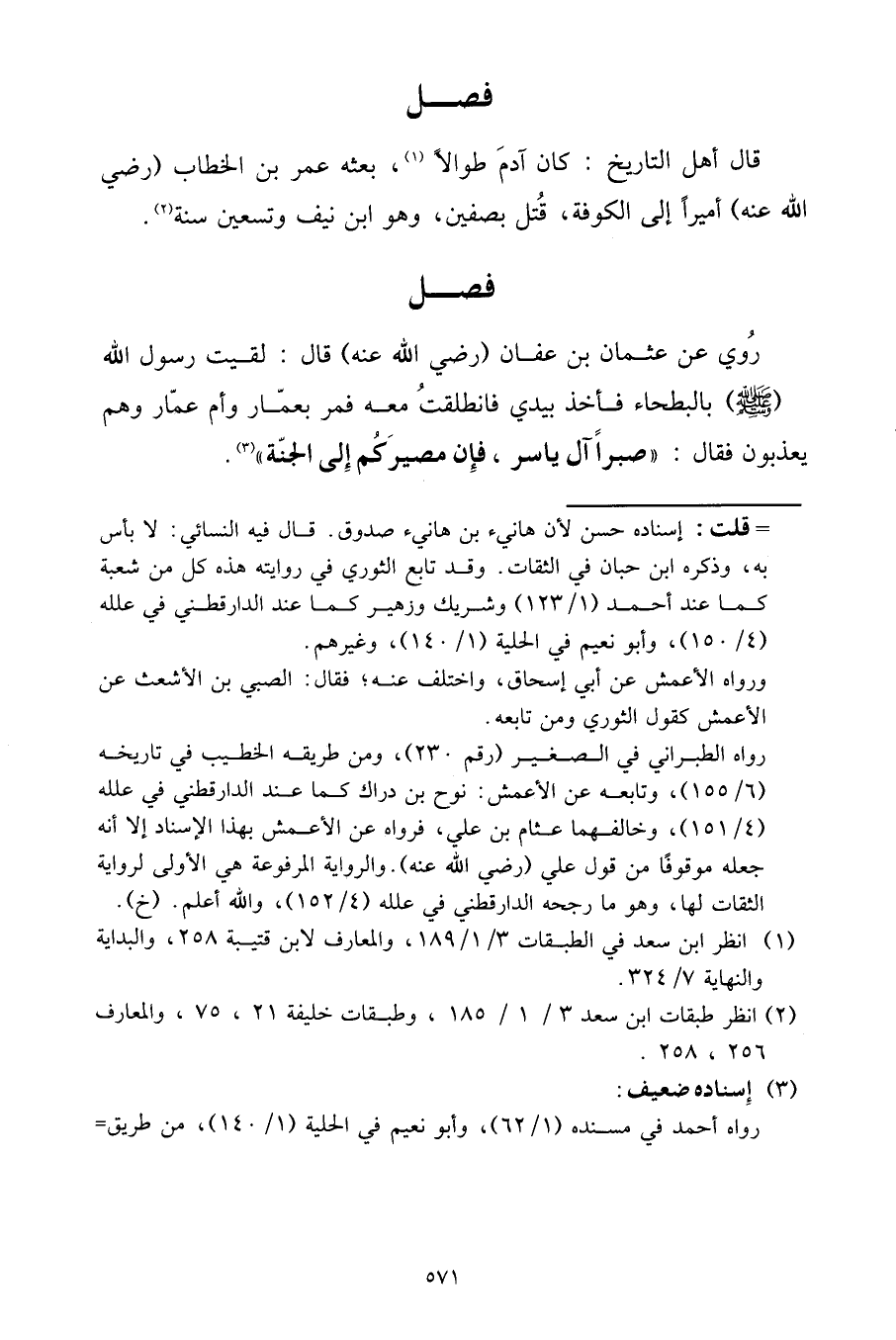 رُوِيَ عَنْ عُثْمَانَ بْنِ عَفَّانَ، رَضِيَ اللَّهُ عَنْهُ، قَالَ: لَقِيتُ رَسُولَ اللَّهِ صَلَّى اللَّهُ عَلَيْهِ وَسَلَّمَ بِالْبَطْحَاءِ فَأَخَذَ بِيَدَيَّ، فَانْطَلَقْتُ مَعَهُ فَمَرَّ بِعَمَّارٍ وَأُمِّ عَمَّارٍ وَهُمْ يُعَذَّبُونَ، فَقَالَ: «صَبْرًا آلَ يَاسِرٍ، فَإِنَّ مَصِيرَكُمْ إِلَى الْجَنَّةِ»