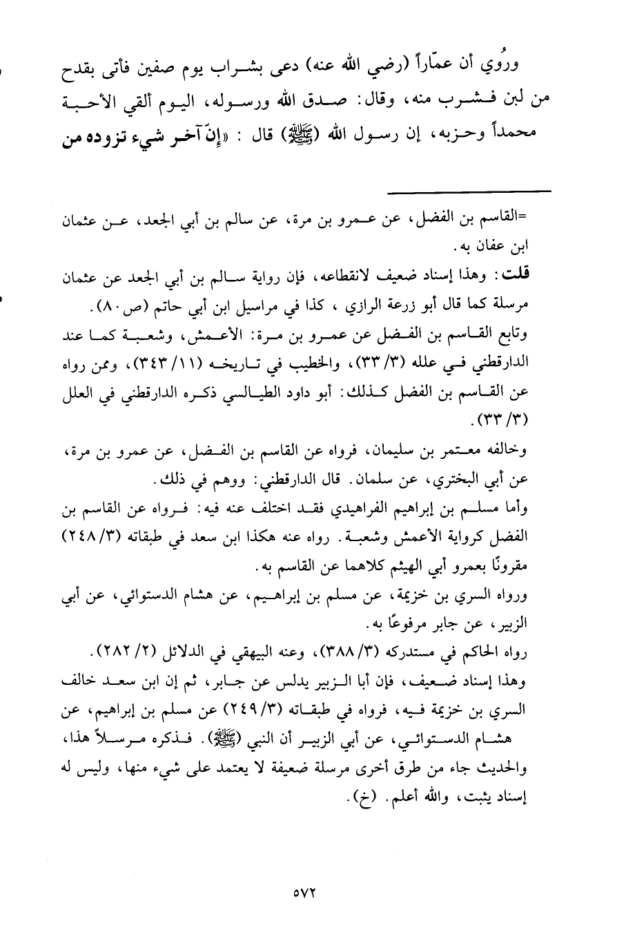 وَرُوِيَ أَنَّ عَمَّارًا، رَضِيَ اللَّهُ عَنْهُ، دَعَى بِشَرَابٍ يَوْمَ صِفِّينَ، فَأُتِي بِقَدَحٍ مِنْ لَبَنٍ فَشَرِبَ مِنْهُ، وَقَالَ: صَدَقَ اللَّهُ وَرَسُولُهُ، الْيَوْمَ أَلْقَى الْأَحِبَّةَ مُحَمَّدًا وَحِزْبَهُ، إِنَّ رَسُولَ اللَّهِ صَلَّى اللَّهُ عَلَيْهِ وَسَلَّمَ قَالَ: «إِنَّ آخِرَ شَيْءٍ تَزَوَّدَهُ مِنَ