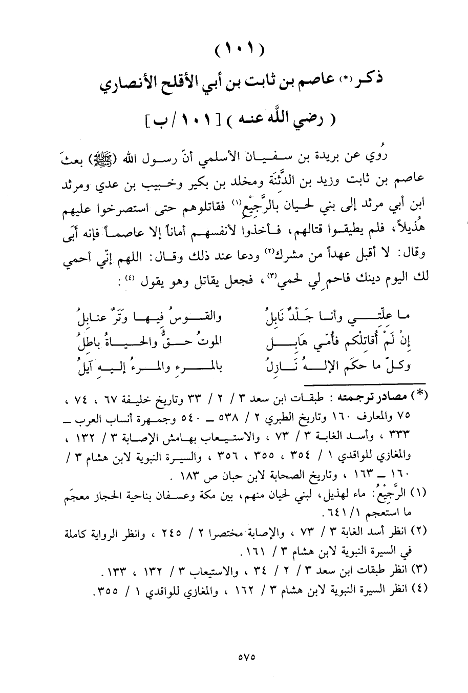 رُوِيَ عَنْ بُرَيْدَةَ بْنِ سُفْيَانَ الْأَسْلَمِيِّ، أَنَّ رَسُولَ اللَّهِ صَلَّى اللَّهُ عَلَيْهِ وَسَلَّمَ بَعَثَ عَاصِمَ بْنَ ثَابِتٍ، وَزَيْدَ بْنَ الدَّثِنَةَ، وَمَخْلَدَ بْنَ بَكِيرٍ، وَخُبَيْبِ بْنِ عَدِيٍّ، وَمَرْثَدَ بْنَ أَبِي مَرْثَدٍ، إِلَى بَنِي لَحْيَانَ بِالرَّجِيعِ، فَقَاتَلُوهُمْ حَتَّى اسْتَصْرَخُوا عَلَيْهِمْ هُذَيْلًا، فَلَمْ يُطِيقُوا قِتَالَهُمْ، فَأَخَذُوا لِأَنْفُسِهِمْ أَمَانًا إِلَّا عَاصِمًا فَإِنَّهُ أَبَى، وَقَالَ: لَا أَقْبَلُ عَهْدًا مِنْ مُشْرِكٍ، وَدَعَا عِنْدَ ذَلِكَ وَقَالَ: اللَّهُمَّ إِنِّي أَحْمِي لَكَ الْيَوْمَ دِينَكَ فَاحْمِ لِي لَحْمِي، فَجَعَلَ يُقَاتِلُ وَهُوَ يَقُولُ: