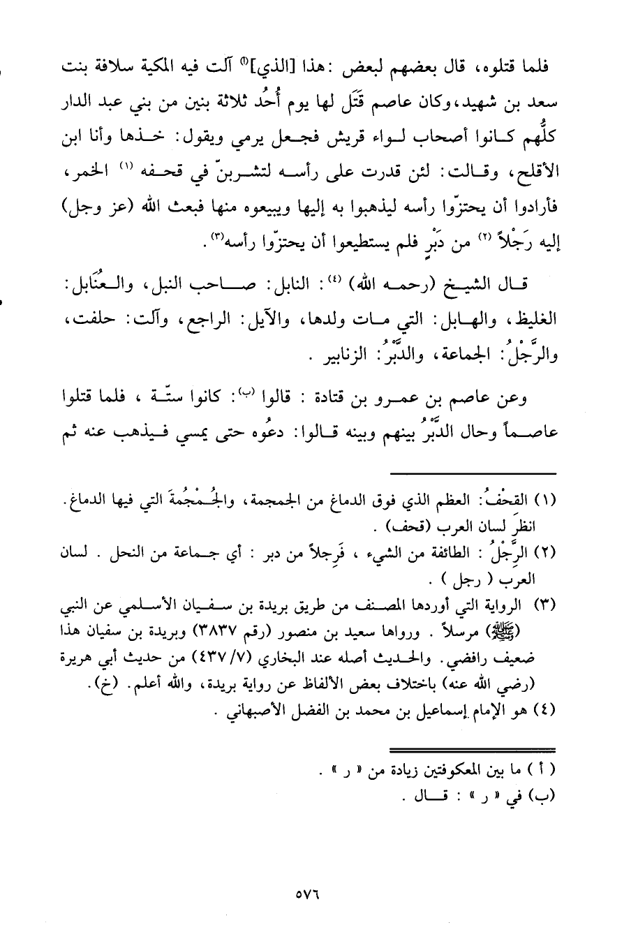 فَلَمَّا قَتَلُوهُ، قَالَ بَعْضُهُمْ لِبَعْضٍ: هَذَا الَّذِي آلَتْ فِيهِ الْمَكِّيَّةُ سُلَافَةُ بِنْتُ سَعْدِ بْنِ شَهِيدٍ، كَانَ عَاصِمٌ قَتَلَ لَهَا يَوْمَ أُحُدٍ ثَلَاثَةَ بَنِينَ مِنْ بَنِي عَبْدِ الدَّارِ كُلَّهُمْ كَانُوا أَصْحَابَ لِوَاءِ قُرَيْشٍ، فَجَعَلَ يَرْمِي وَيَقُولُ: خُذْهَا وَأَنَا ابْنُ الْأَقْلَحِ، وَقَالَتْ: لَئِنْ قَدِرَتْ عَلَى رَأْسِهِ لَتَشْرَبَنَّ فِي قُحْفِهِ الْخَمْرَ، فَأَرَادُوا أَنْ يَحْتَزُّوا رَأْسَهُ لَيَذْهَبُوا بِهِ إِلَيْهَا وَيَبِيعُوهُ مِنْهَا، فَبَعَثَ اللَّهُ عَزَّ وَجَلَّ إِلَيْهِ رَجْلًا مِنْ دَبْرٍ، فَلَمْ يَسْتَطِيعُوا أَنْ يَجْتَزُّوا رَأْسَهُ.