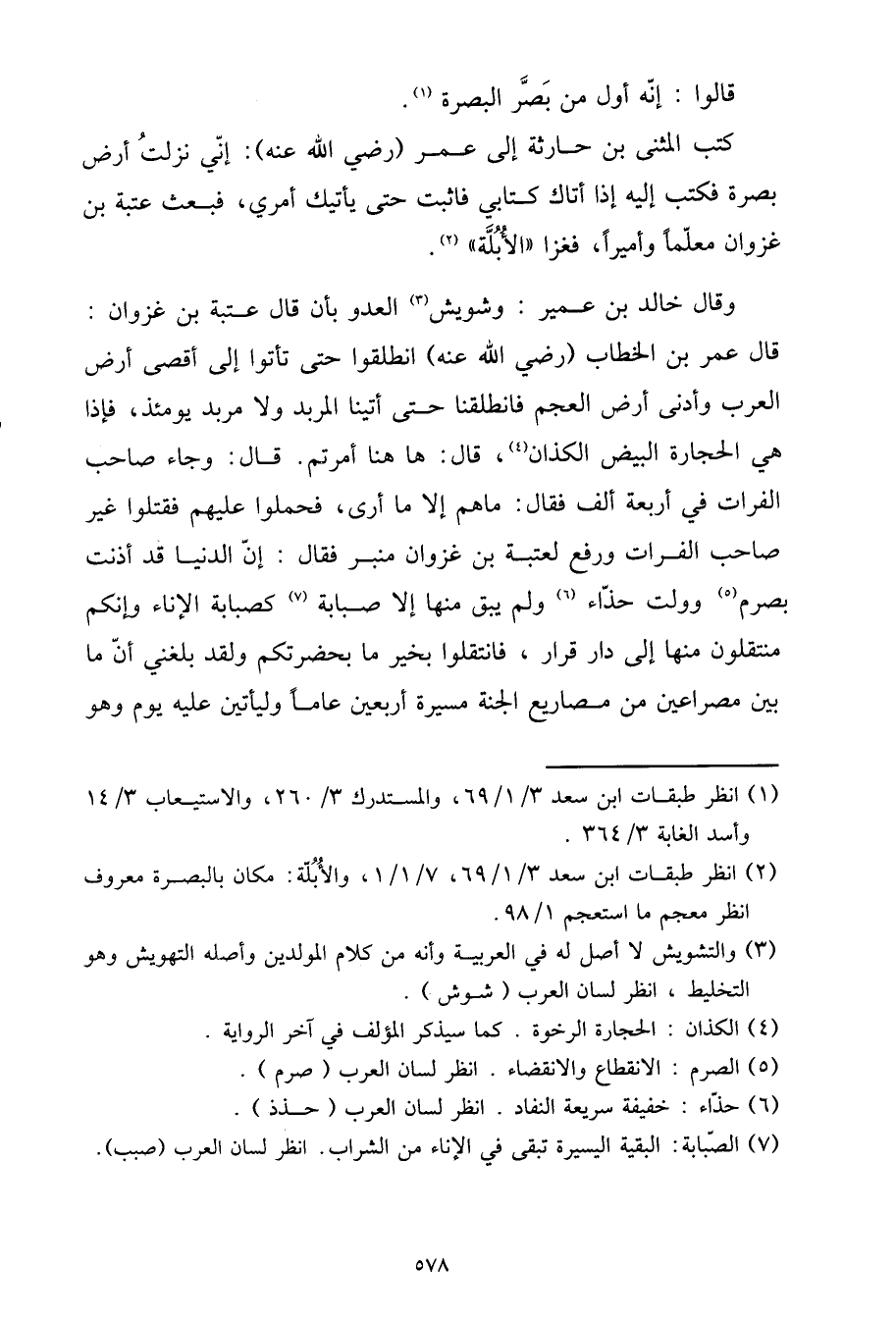 كَتَبَ الْمُثَنَّى بْنُ حَارِثَةَ إِلَى عُمَرَ رَضِيَ اللَّهُ عَنْهُ: إِنِّي نَزَلْتُ أَرْضَ بَصْرَةَ، فَكَتَبَ إِلَيْهِ إِذَا أَتَاكَ كِتَابِي، فَاثْبُتْ حَتَّى يَأْتِيَكَ أَمْرِي، فَبَعَثَ عُتْبَةَ بْنَ غَزْوَانَ مُعَلِّمًا وَأَمِيرًا، فَغَزَا الْأُبُلَّةَ.
