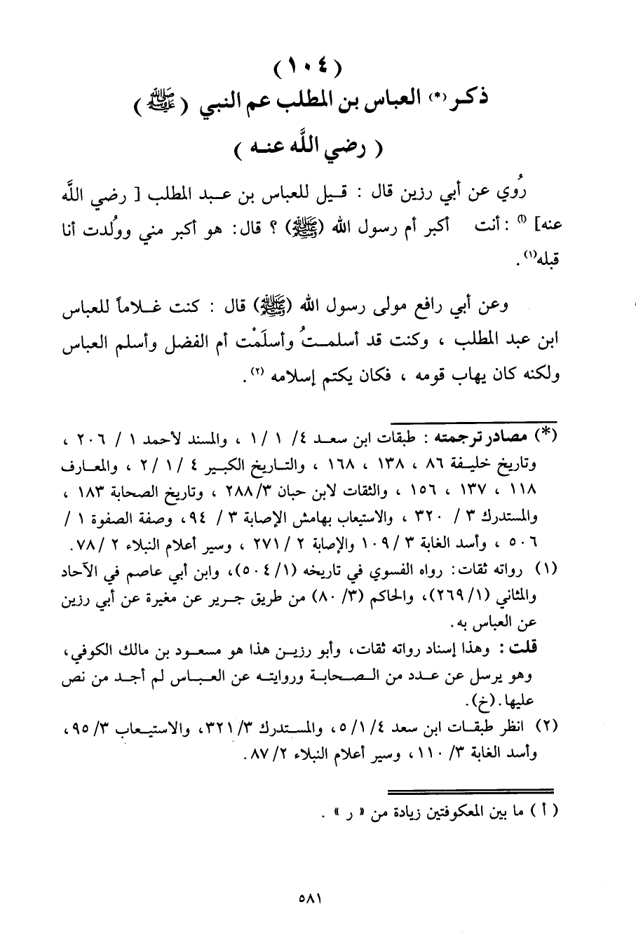 رُوِيَ عَنْ أَبِي رَزِينٍ، قَالَ: قِيلَ لِلْعَبَّاسِ بْنِ عَبْدِ الْمُطَّلِبِ، رَضِيَ اللَّهُ عَنْهُ: أَنْتَ أَكْبَرُ أَمْ رَسُولُ اللَّهِ صَلَّى اللَّهُ عَلَيْهِ وَسَلَّمَ؟ قَالَ: هُوَ أَكْبَرُ مِنِّي، وَوُلِدْتُ أَنَا قَبْلَهُ.