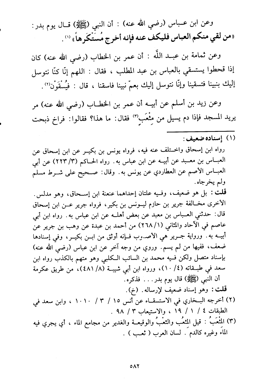 وَعَنِ ابْنِ عَبَّاسٍ، رَضِيَ اللَّهُ عَنْهُ، أَنَّ النَّبِيِّ صَلَّى اللَّهُ عَلَيْهِ وَسَلَّمَ قَالَ يَوْمَ بَدْرٍ: «مَنْ لَقِيَ مِنْكُمُ الْعَبَّاسَ فَلْيَكُفَّ عَنْهُ فَإِنَّهُ أُخْرِجَ مُسَتْكَرَهًا» وَعَنْ ثُمَامَةَ بْنِ عَبْدِ اللَّهِ، أَنَّ عُمَرَ بْنِ الْخَطَّابِ، رَضِيَ اللَّهُ عَنْهُ، كَانَ إِذَا قَحَطُوا يَسْتَسْقِي بِالْعَبَّاسِ بْنِ عَبْدِ الْمُطَّلِبِ، فَقَالَ: اللَّهُمَّ إِنَّا كُنَّا نَتَوَسَّلُ إِلَيْكَ بَنَبِيِّنَا، فَتَسْقِينَا وَإِنَّا نَتَوَسَّلُ إِلَيْكَ بِعَمِّ نَبِيِّنَا فَاسْقِنَا، قَالَ: فَيُسْقَوْنَ.