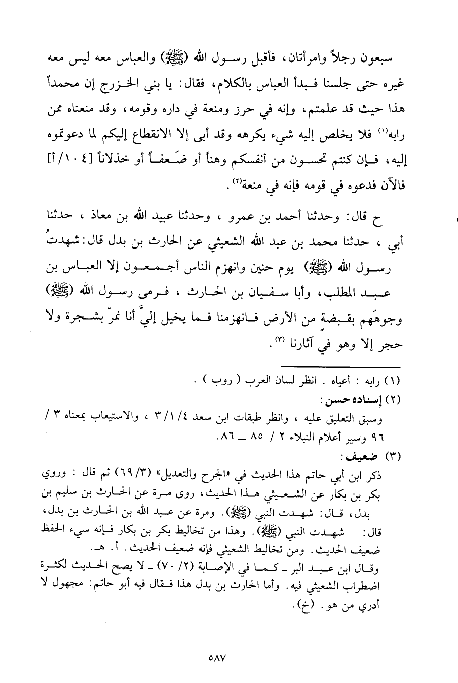 ح قَالَ: وَحَدَّثَنَا أَحْمَدُ بْنُ عَمْرٍو، وَحَدَّثَنَا عُبَيْدُ اللَّهِ بْنُ مُعَاذٍ، حَدَّثَنَا أَبِي، حَدَّثَنَا مُحَمَّدُ بْنُ عَبْدِ اللَّهِ الشُّعَيْثِيُّ، عَنِ الْحَارِثِ بْنِ بَدَلٍ، قَالَ: شَهِدْتُ رَسُولَ اللَّهِ صَلَّى اللَّهُ عَلَيْهِ وَسَلَّمَ يَوْمَ حُنَيْنٍ، وَانْهَزَمَ النَّاسُ أَجْمَعُونَ إِلَّا الْعَبَّاسَ بْنَ عَبْدِ الْمُطَّلِبِ، وَأَبَا سُفْيَانَ بْنَ الْحَارِثِ «فَرَمَى رَسُولُ اللَّهِ صَلَّى اللَّهُ عَلَيْهِ وَسَلَّمَ وُجُوهَهُمُ بِقَبْضَةٍ مِنَ الْأَرْضِ» .