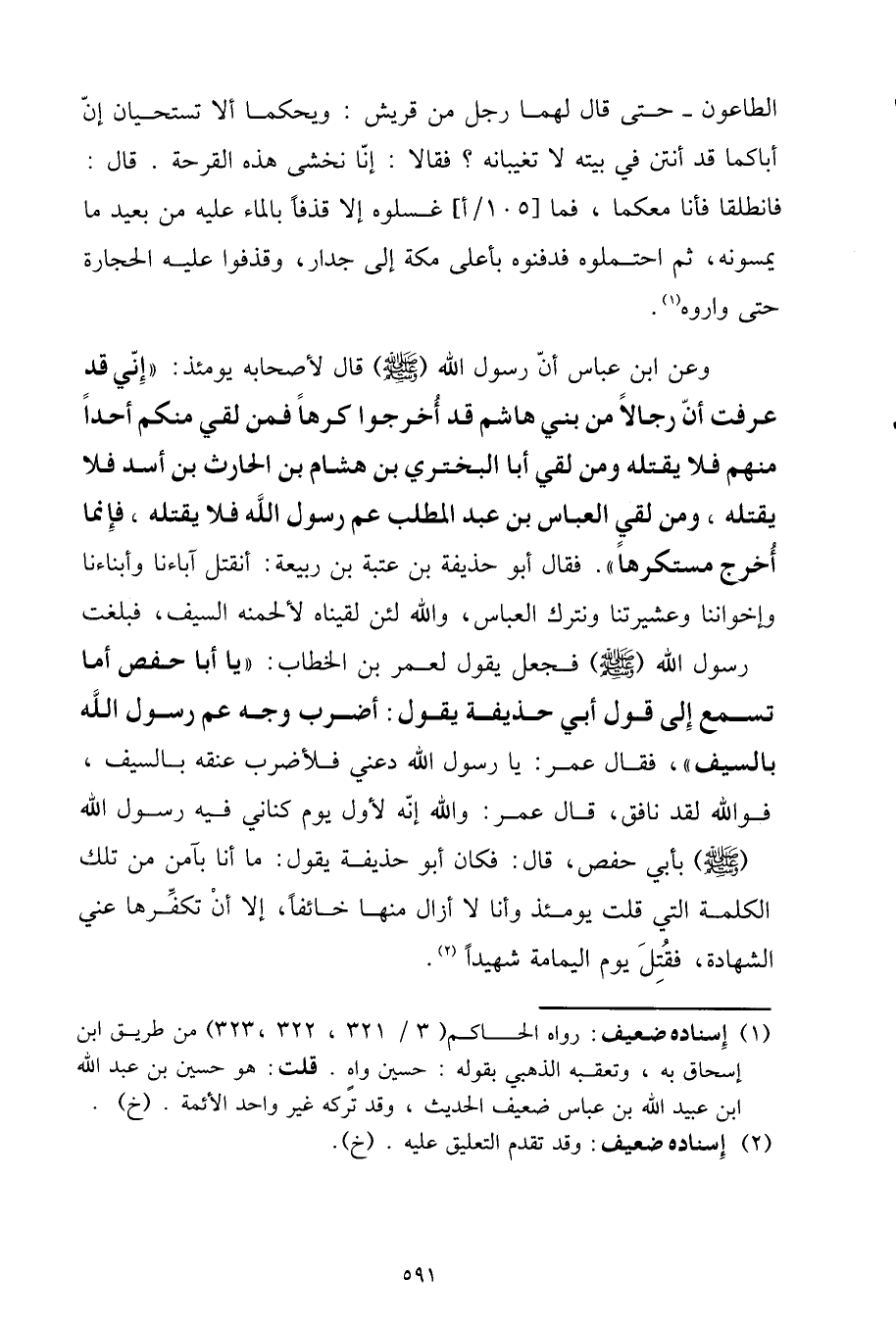 فَقَالَ أَبُو حُذَيْفَةَ بْنُ عُتْبَةَ بْنِ رَبِيعَةَ: أَنَقْتُلُ آبَاءَنَا، وَأَبْنَاءَنَا، وَإِخْوَانَنَا، وَعَشِيرَتَنَا، وَنَتْرُكُ الْعَبَّاسَ؟ وَاللَّهِ لَئِنْ لَقِينَاهُ لِأُلْحِمَنَّهُ السَّيْفَ، فَبَلَغَتْ رَسُولَ اللَّهِ صَلَّى اللَّهُ عَلَيْهِ وَسَلَّمَ فَجَعَلَ يَقُولُ لِعُمَرَ بْنِ الْخَطَّابِ: " يَا أَبَا حَفْصٍ، أَمَا تَسْمَعُ إِلَى قَوْلِ أَبِي حُذَيْفَةَ يَقُولُ: أَضْرِبُ وَجْهَ عَمِّ رَسُولِ اللَّهِ بِالسَّيْفِ "، فَقَالَ عُمَرُ: يَا رَسُولَ اللَّهِ، دَعْنِي فَلأَضْرِبُ عُنُقَهُ بِالسَّيْفِ، فَوَاللَّهِ لَقَدْ نَافَقَ، قَالَ عُمَرُ: وَاللَّهِ إِنَّهُ لَأَوَّلُ يَوْمٍ كَنَانِي فِيهِ رَسُولُ اللَّهِ صَلَّى اللَّهُ عَلَيْهِ وَسَلَّمَ بِأَبِي حَفْصٍ، قَالَ: فَكَانَ أَبُو حُذَيْفَةَ، يَقُولُ: مَا أَنَا بِآمِنٍ مِنْ تِلْكَ الْكَلِمَةِ الَّتِي قُلْتُ يَوْمَئِذٍ، وَأَنَا لَا أَزَالُ مِنْهَا خَائِفًا إِلَّا أَنْ تُكَفِّرَهَا عَنِّي الشَّهَادَةُ، فَقُتِلَ يَوْمَ الْيَمَامَةِ شَهِيدًا