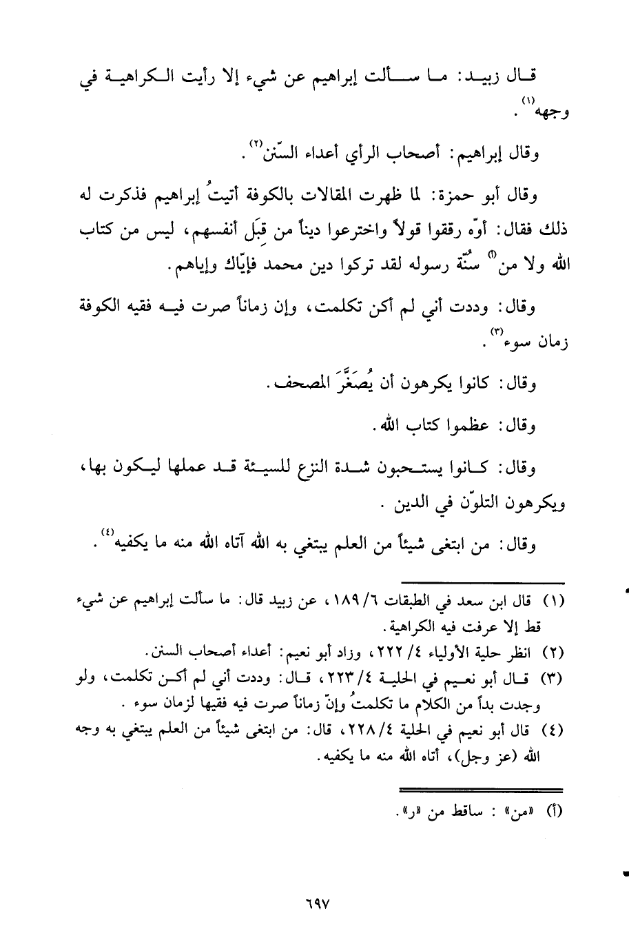 وَقَالَ أَبُو حَمْزَةَ: لَمَّا ظَهَرَتِ الْمَقَالَاتُ بِالْكُوفَةِ أَتَيْتُ إِبْرَاهِيمَ، فَذَكَرْتُ لَهُ ذَلِكَ، فَقَالَ: أَوَّهُ رَقَّقُوا قَوْلًا وَاخْتَرَعُوا دِينًا مِنْ قِبَلِ أَنْفُسِهِمْ، لَيْسَ مِنْ كِتَابِ اللَّهِ، وَلَا مِنْ سُنَّةِ رَسُولِهِ، لَقَدْ تَرَكُوا دِينَ مُحَمَّدٍ، فَإِيَّاكَ وَإِيَّاهُمْ.