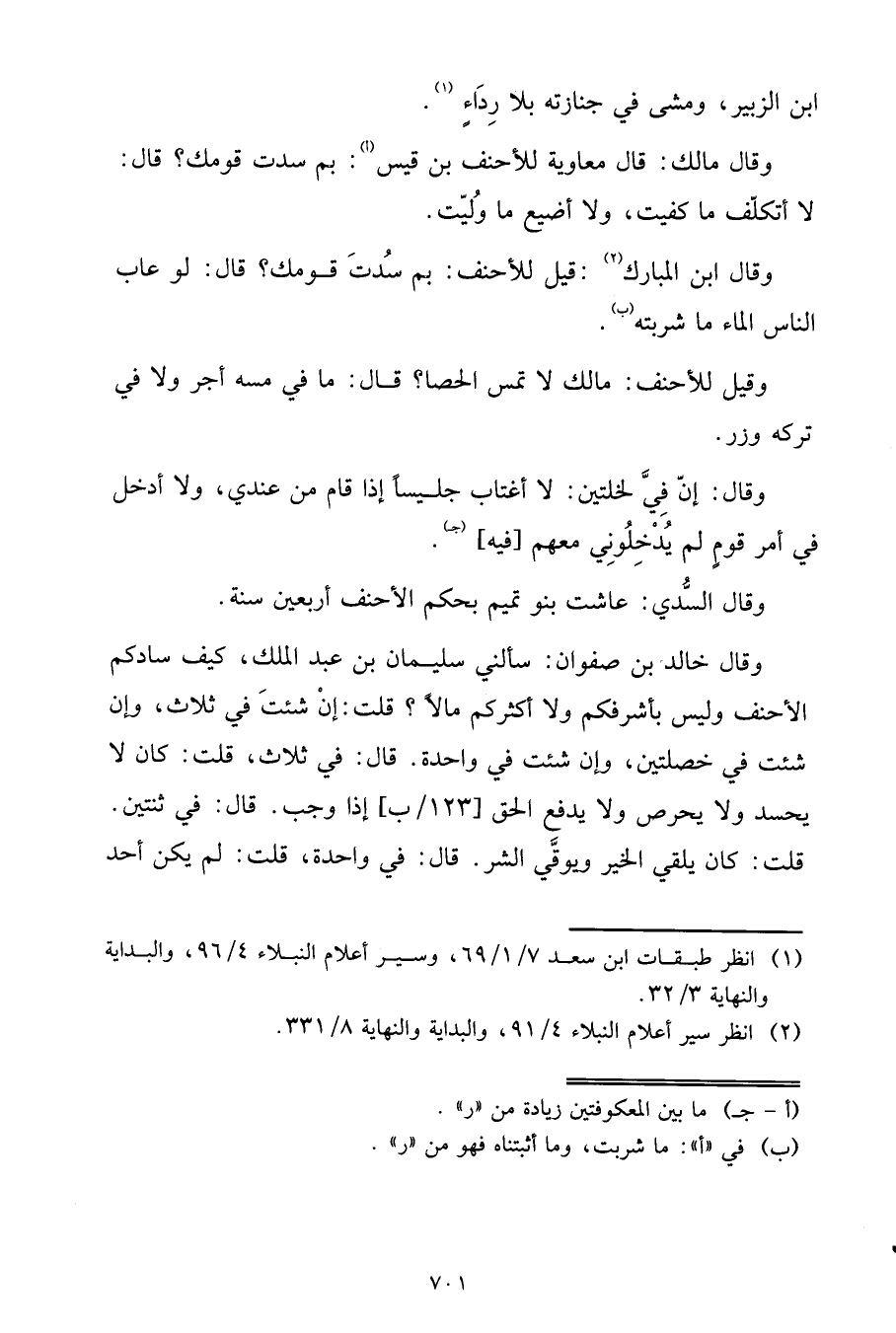 وَقَالَ ابْنُ الْمُبَارَكِ: قِيلَ لِلْأَحْنَفِ: بِمَ سُدْتَ قَوْمَكَ؟ قَالَ: لَوْ عَابَ النَّاسُ الْمَاءَ مَا شَرِبْتُهُ.