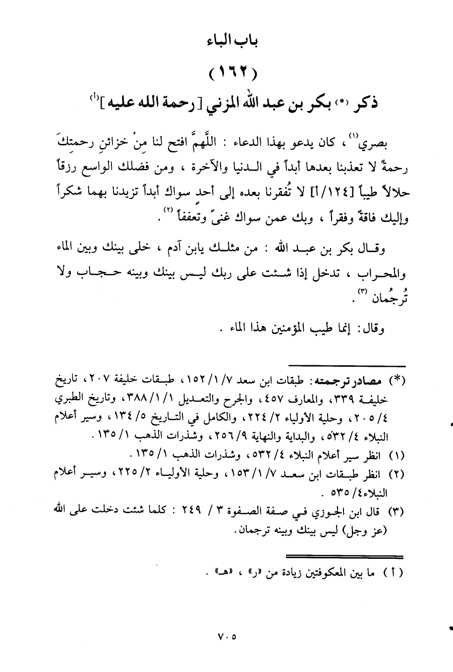 وَقَالَ بَكْرُ بْنُ عَبْدِ اللَّهِ: مَنْ مِثْلُكَ يَابْنَ آدَمَ، خَلِّي بَيْنَكَ وَبَيْنَ الْمَاءِ وَالْمِحْرَابِ، تَدْخُلُ إِذَا شِئْتَ عَلَى رَبِّكَ لَيْسَ بَيْنَكَ وَبَيْنَهُ حِجَابٌ وَلَا تُرْجُمَانٌ.