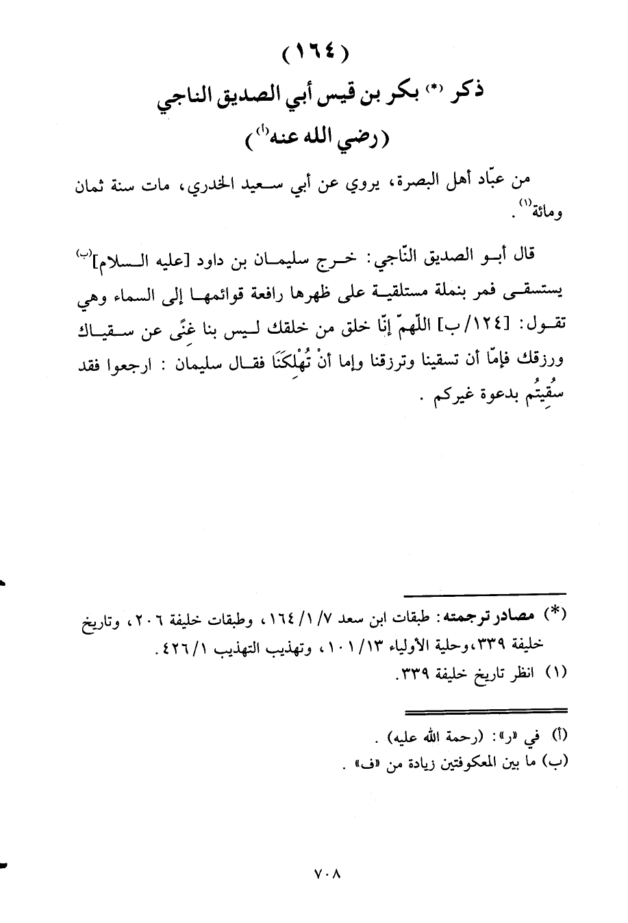 قَالَ أَبُو الصِّدِّيقِ النَّاجِيُّ: خَرَجَ سُلَيْمَانُ بْنُ دَاوُدَ عَلَيْهِ السَّلَامُ يَسْتَسْقِي فَمَرَّ بِنَمْلَةٍ مُسْتَلْقِيَةٍ عَلَى ظَهْرِهَا رَافِعَةٍ قَوَائِمَهَا إِلَى السَّمَاءِ , وَهِيَ تَقُولُ: اللَّهُمَّ إِنَّا خَلْقٌ مِنْ خَلْقِكَ لَيْسَ بِنَا غِنًى عَنْ سُقْيَاكَ وَرِزْقِكَ، فإما أَنْ تَسْقِيَنَا وَتَرْزُقَنَا، وَإِمَّا أَنْ تُهْلِكَنَا، فَقَالَ سُلَيْمَانُ: ارْجِعُوا، فَقَدْ سُقِيتُمْ بِدَعْوَةِ غَيْرِكُمْ.