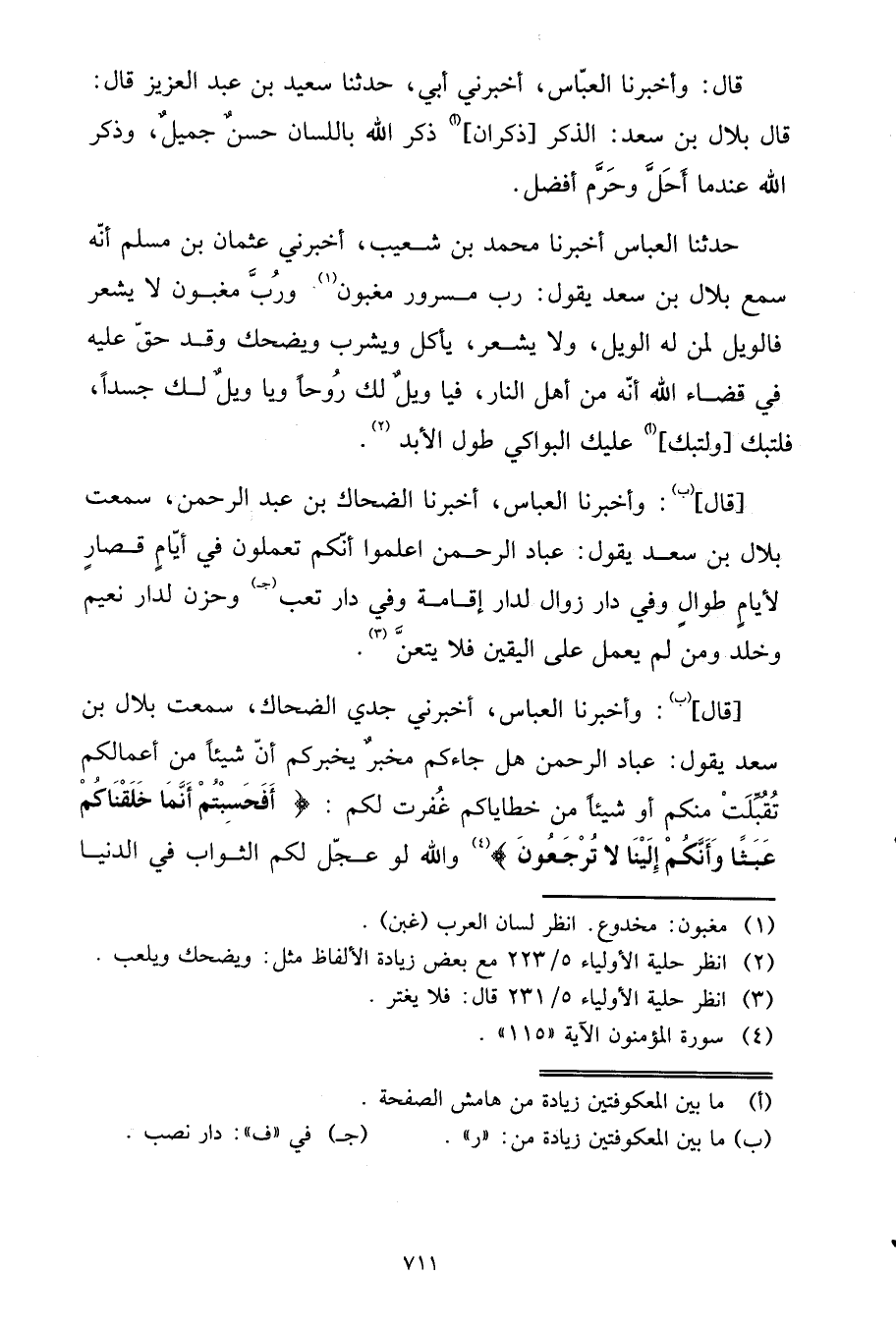 قَالَ: وَأَخْبَرَنَا الْعَبَّاسُ , أَخْبَرَنِي جَدِّي الضَّحَّاكُ , سَمِعْتُ بِلَالَ بْنَ سَعْدٍ , يَقُولُ: " عِبَادَ الرَّحْمَنِ هَلْ جَاءَكُمْ مُخْبِرٌ يُخْبِرُكُمْ أَنَّ شَيْئًا مِنْ أَعْمَالِكُمْ تُقُبِّلَتْ مِنْكُمْ أَوْ شَيْئًا مِنْ خَطَايَاكُمْ غُفِرَتْ لَكُمْ: {أَفَحَسِبْتُمْ أَنَّمَا خَلَقْنَاكُمْ عَبَثًا وَأَنَّكُمْ إِلَيْنَا لا تُرْجَعُونَ} [المؤمنون: ١١٥] .