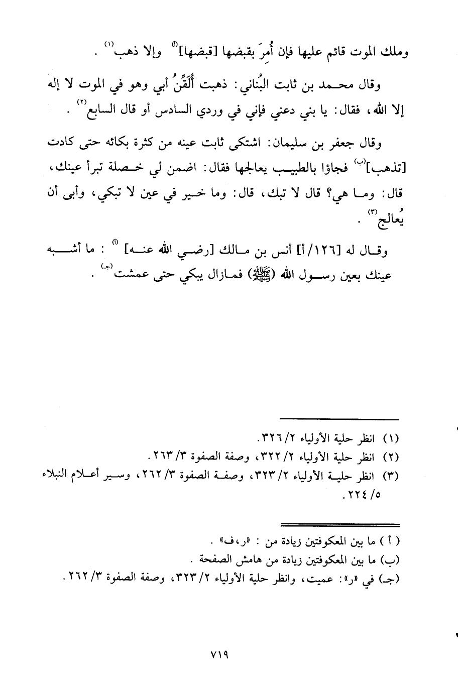 وَقَالَ جَعْفَرُ بْنُ سُلَيْمَانَ: اشْتَكَى ثَابِتٌ عَيْنَهُ مِنْ كَثْرَةِ بُكَائِهِ حَتَّى كَادَتْ تَذْهَبُ فَجَاءُوا بِالطَّبِيبِ يُعَالِجُهَا , فَقَالَ: اضْمَنْ لِي خِصْلَةً تَبْرَأُ عَيْنُكَ، قَالَ: وَمَا هِيَ؟ قَالَ: لَا تَبْكِ، قَالَ: وَمَا خَيْرٌ فِي عَيْنٍ لَا تَبْكِي، وَأَبَى أَنْ يُعَالَجَ.