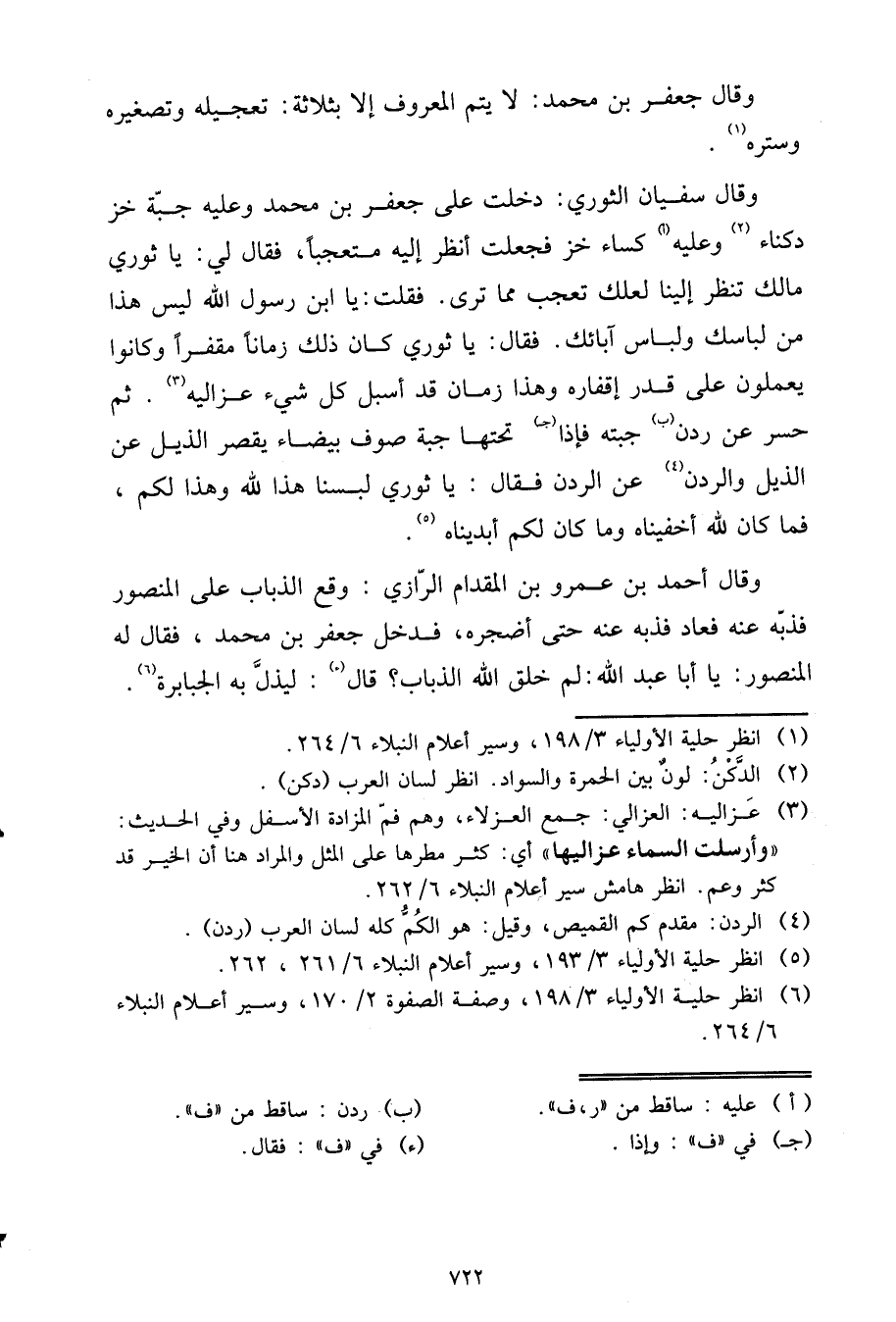 وَقَالَ سُفْيَانُ الثَّوْرِيُّ: دَخَلْتُ عَلَى جَعْفَرِ بْنِ مُحَمَّدٍ وَعَلَيْهِ جُبَّةُ خَزٍّ دَكْنَاءُ , وَعَلَيْهِ كِسَاءُ خَزٍّ , فَجَعَلْتُ أَنْظُرُ إِلَيْهِ مُتَعَجِّبًا، فَقَالَ لِي: يَا ثَوْرِيُّ مَالَكَ تَنْظُرُ إِلَيْنَا لَعَلَّكَ تَعْجَبُ مِمَّا تَرَى.