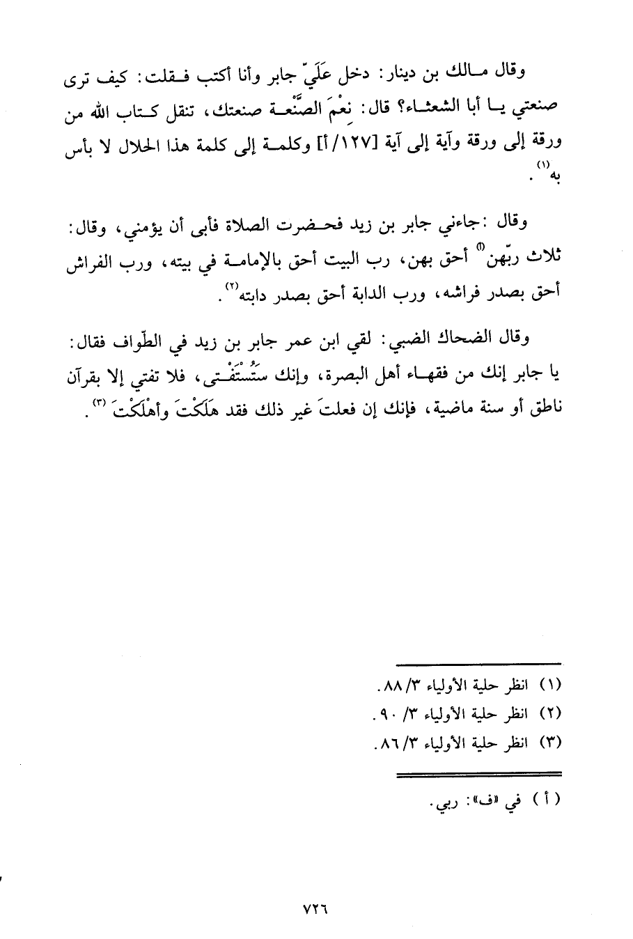 وَقَالَ مَالِكُ بْنُ دِينَارٍ: دَخَلَ عَليَّ جَابِرٌ وَأَنَا أَكْتُبُ , فَقُلْتُ: كَيْفَ تَرَى صَنْعَتِي يَا أَبَا الشَّعْثَاءِ؟ قَالَ: نِعْمَ الصَّنْعَةُ صَنْعَتُكَ، تَنْقِلُ كِتَابَ اللَّهِ مِنْ وَرَقَةٍ إِلَى وَرَقَةٍ وَآيَةً إِلَى آيَةٍ وَكَلِمَةً إِلَى كَلِمَةٍ هَذَا الْحَلَالُ لَا بَأْسَ بِهِ.