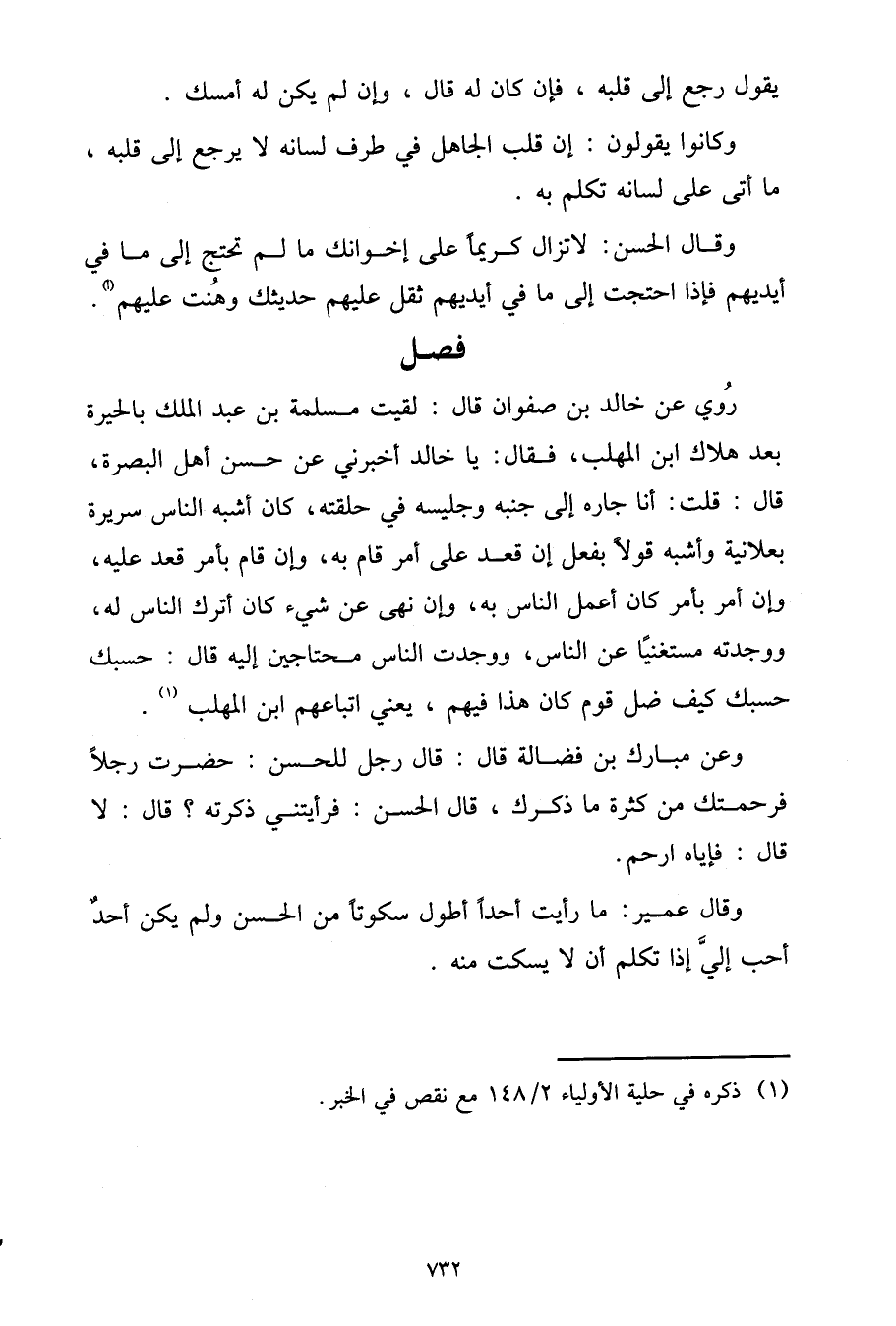 رُوِيَ عَنْ خَالِدِ بْنِ صَفْوَانَ، قَالَ: لَقِيتُ مَسْلَمَةَ بْنَ عَبْدِ الْمَلِكِ بِالْحِيرَةِ بَعْدَ هَلَاكِ ابْنِ الْمُهَلَّبِ، فَقَالَ: يَا خَالِدُ أَخْبِرْنِي عَنْ حَسَنِ أَهْلِ الْبَصْرَةِ، قَالَ: قُلْتُ: أَنَا جَارُهُ إِلَى جَنْبِهِ وَجَلِيسُهُ فِي حَلَقَتِهِ، كَانَ أَشْبَهَ النَّاسِ سَرِيرَةً بِعَلَانِيَةٍ وَأَشْبَهَ قَوْلًا بِفِعْلٍ إِنْ قَعَدَ عَلَى أَمْرٍ قَامَ بِهِ، وَإِنْ قَامَ بِأَمْرٍ قَعَدَ عَلَيْهِ، وَإِنْ أَمَرَ بِأَمْرٍ كَانَ أَعْمَلَ النَّاسِ بِهِ، وَإِنْ نَهَى عَنْ شَيْءٍ كَانَ أَتْرَكَ النَّاسِ لَهُ، وَوَجَدْتُهُ مُسْتَغْنِيًا عَنِ النَّاسِ، وَوَجَدْتُ النَّاسَ مُحْتَاجِينَ إِلَيْهِ قَالَ: حَسْبُكَ حَسْبُكَ، كَيْفَ ضَلَّ قَوْمٌ كَانَ هَذَا فِيهِمْ، يَعْنِي اتِّبَاعَهُمُ ابْنَ الْمُهَلَّبِ.