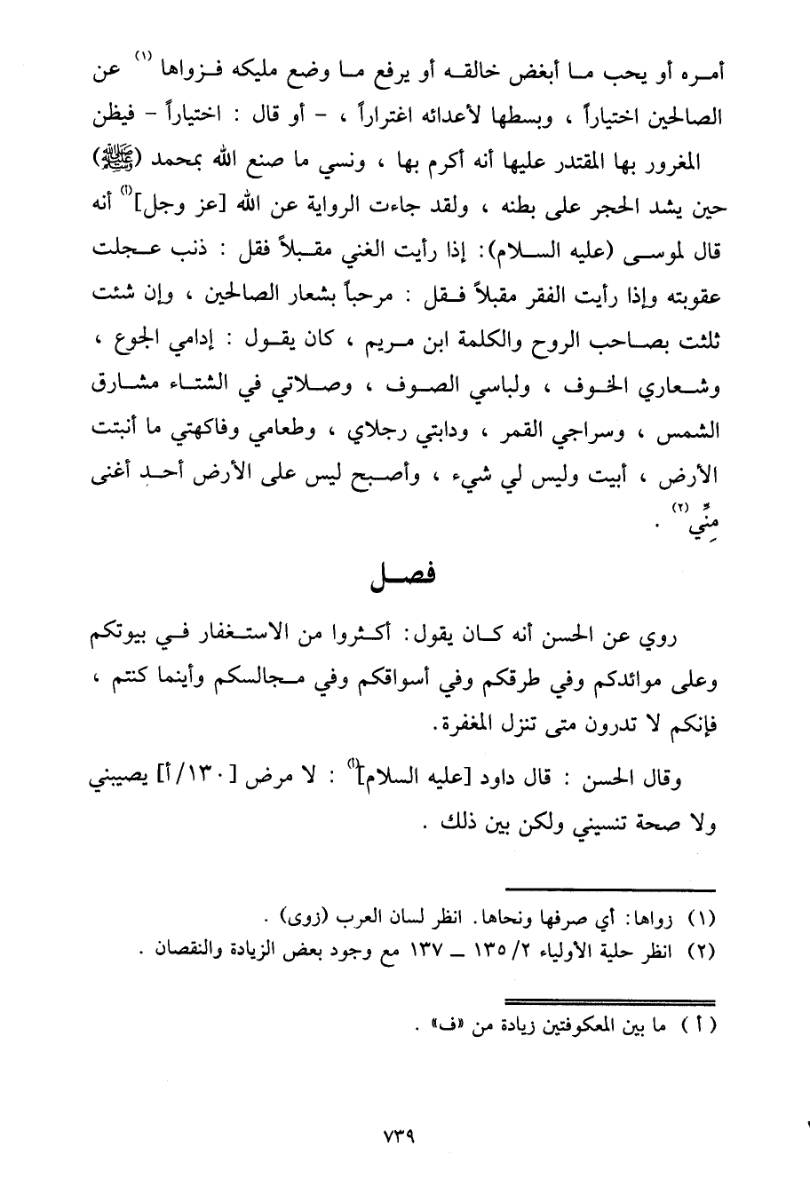 أَمْرَهُ أَوْ يُحِبُّ مَا أَبْغَضَ خَالِقُهُ أَوْ يَرْفَعُ مَا وَضَعَ مَلِيكُهُ فَزَوَاهَا عَنِ الصَّالِحِينَ اخْتِيَارًا، وَبَسَطَهَا لِأَعْدَائِهِ اغْتِرَارًا أَوْ قَالَ اخْتِيَارًا، فَيَظُنُّ الْمَغْرُورُ بِهَا الْمُقْتَدِرُ عَلَيْهَا أَنَّهُ أُكْرِمَ بِهَا، وَنَسِيَ مَا صَنَعَ اللَّهُ بِمُحَمَّدٍ صَلَّى اللَّهُ عَلَيْهِ وَسَلَّمَ حِينَ يَشُدُّ الْحَجَرَ عَلَى بَطْنِهِ، وَلَقَدْ جَاءَتِ الرِّوَايَةُ عَنِ اللَّهِ عَزَّ وَجَلَّ، أَنَّهُ قَالَ لِمُوسَى عَلَيْهِ السَّلَامَ: " إِذَا رَأَيْتَ الْغِنَى مُقْبِلًا , فَقُلْ: ذَنْبٌ عُجِّلَتْ عُقُوبَتُهُ، وَإِذَا رَأَيْتَ الْفَقْرَ مُقْبِلًا , فَقُلْ: مَرْحَبًا بِشِعَارِ الصَّالِحِينَ، وَإِنْ شِئْتَ ثَلَّثْتَ بِصَاحِبِ الرُّوحِ وَالْكَلِمَةِ ابْنِ مَرْيَمَ، كَانَ يَقُولُ: إِدَامِي الْجُوعُ، وَشِعَارِي الْخَوْفُ، وَلِبَاسِي الصُّوفُ، وَصَلَاتِي فِي الشِّتَاءِ مَشَارِقُ الشَّمْسِ، وَسِرَاجِي الْقَمَرُ، وَدَابَّتِي رِجْلَايَ، وَطَعَامِي وَفَاكِهَتِي مَا أَنْبَتَتِ الْأَرْضُ، أَبِيتُ وَلَيْسَ لِي شَيْءٌ، وَأَصْبَحَ لَيْسَ عَلَى الْأَرْضِ أَحَدٌ أَغْنَى مِنِّي.