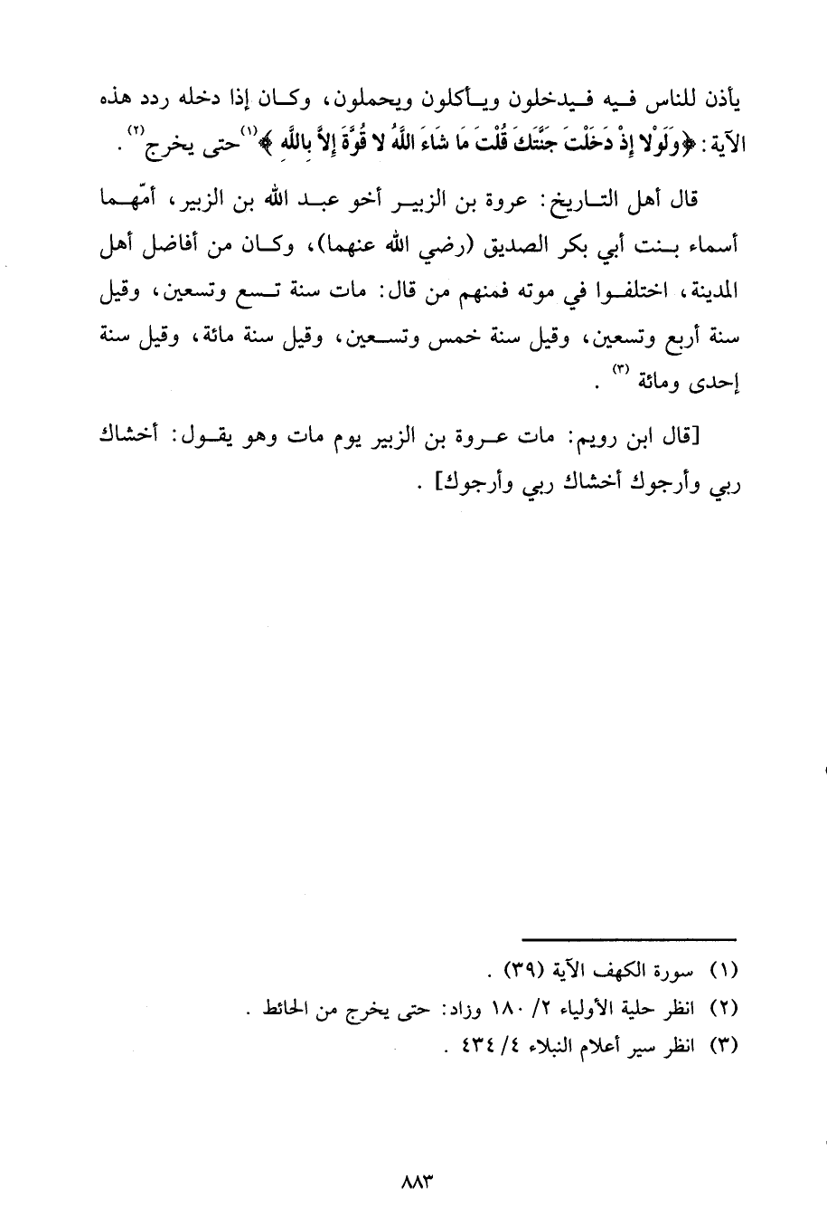 قَالَ أَهْلُ التَّارِيخِ: عُرْوَةُ بْنُ الزُّبَيْرِ أَخُو عَبْدِ اللَّهِ بْنِ الزُّبَيْرِ، أُمُّهُمَا أَسْمَاءُ بِنْتُ أَبِي بَكْرِ الصِّدِّيقِ رَضِيَ اللَّهُ عَنْهُمَا، وَكَانَ مِنْ أَفَاضِلِ أَهْلِ الْمَدِينَةِ، اخْتَلَفُوا فِي مَوْتِهِ فَمِنْهُمْ مَنْ قَالَ: مَاتَ سَنَةَ تِسْعٍ وَتِسْعِينَ، وَقِيلَ: سَنَةَ أَرْبَعٍ وَتِسْعِينَ، وَقِيلَ: سَنَةَ خَمْسٍ وَتِسْعِينَ، وَقِيلَ: سَنَةَ مِائَةٍ، وَقِيلَ: سَنَةَ إِحْدَى وَمِائَةٍ.