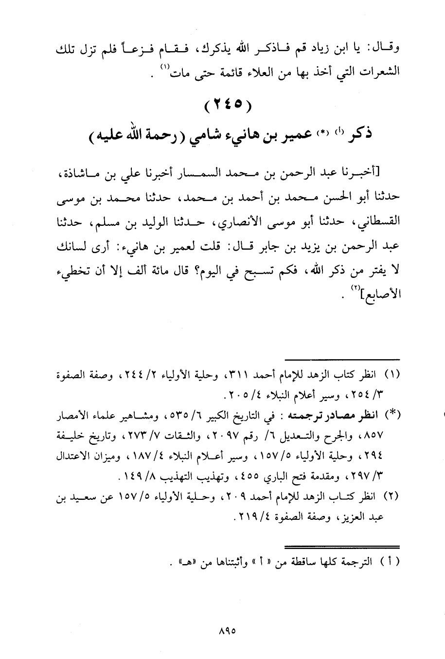 أَخْبَرَنَا عَبْدُ الرَّحْمَنِ بْنُ مُحَمَّدٍ السِّمْسَارُ، أَخْبَرَنَا عَلِيُّ بْنُ مَاشَاذَةَ، حَدَّثَنَا أَبُو الْحَسَنِ مُحَمَّدُ بْنُ أَحْمَدَ بْنِ مُحَمَّدٍ، حَدَّثَنَا مُحَمَّدُ بْنُ مُوسَى الْقَسْطَانِيُّ، حَدَّثَنَا أَبُو مُوسَى الْأَنْصَارِيُّ، حَدَّثَنَا الْوَلِيدُ بْنُ مُسْلِمٍ، حَدَّثَنَا عَبْدُ الرَّحْمَنِ بْنُ يَزِيدَ بْنِ جَابِرٍ , قَالَ " قُلْتُ لِعُمَيْرِ بْنِ هَانِئٍ: أَرَى لِسَانَكَ لَا يَفْتُرُ مِنْ ذِكْرِ اللَّهِ، فَكَمْ تُسَبِّحُ فِي الْيَوْمِ؟ قَالَ: مِائَةَ أَلْفٍ إِلَّا أَنْ تُخْطِئَ الْأَصَابِعُ