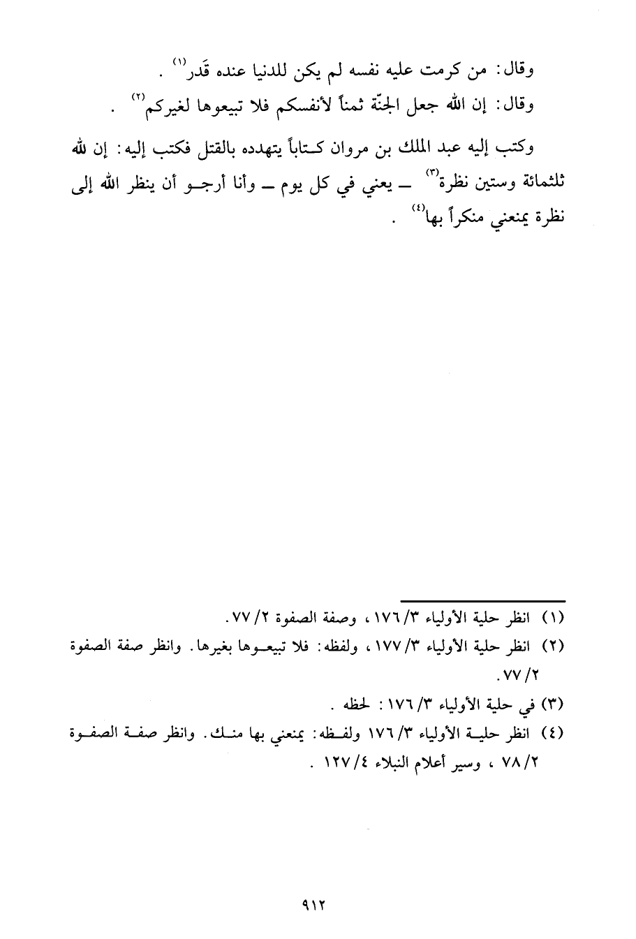 وكتب إليه عبد الملك بن مروان كتابا يتهدده بالقتل، فكتب إليه إن لله ثلاث مائة وستين نظرة، يعني في كل يوم، وأنا أرجو أَنْ يَنْظُرَ اللَّهُ إِلَيَّ نَظْرَةً يَمْنَعُنِي مُنْكَرًا بِهَا.