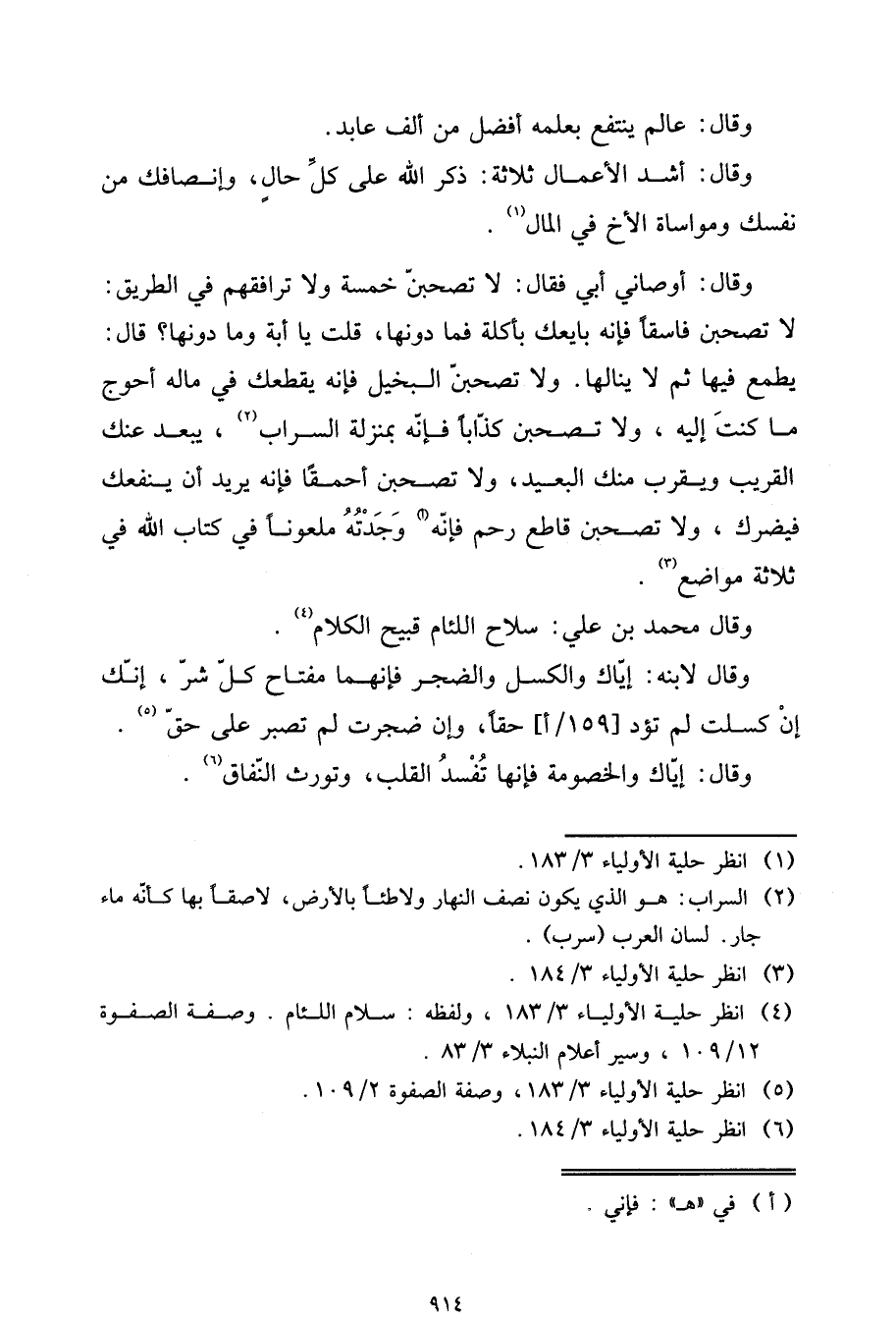 وَلَا تَصْحَبَنَّ الْبَخِيلَ فَإِنَّهُ يَقْطَعُكَ فِي مَالِهِ أَحْوَجَ مَا كُنْتَ إِلَيْهِ، وَلَا تَصْحَبَنَّ كَذَّابًا فَإِنَّهُ بِمَنْزِلَةِ السَّرَابِ، يُبْعِدُ عَنْكَ الْقَرِيبَ وَيُقَرِّبُ مِنْكَ الْبَعِيدَ، وَلَا تَصْحَبَنَّ أَحْمَقًا فَإِنَّهُ يُرِيدُ أَنْ يَنْفَعَكَ فَيَضُرَّكَ، وَلَا تَصْحَبَنَّ قَاطِعَ رَحِمٍ فَإِنَّهُ وَجَدْتُهُ مَلْعُونًا فِي كِتَابِ اللَّهِ فِي ثَلَاثِ مَوَاضِعٍ.