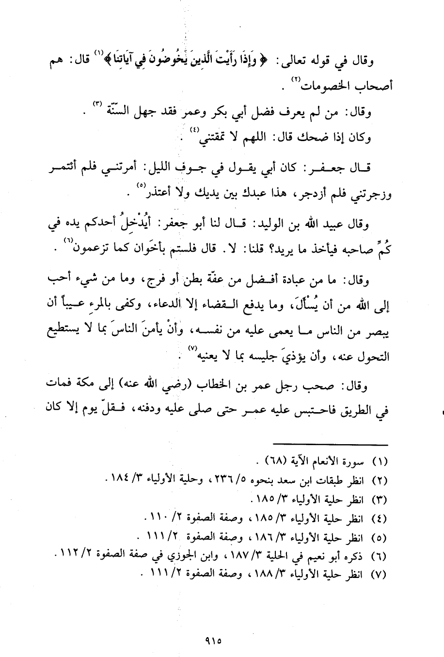 وَقَالَ: مَا مِنْ عِبَادَةٍ أَفْضَلُ مِنْ عِفَّةِ بَطْنٍ أَوْ فَرْجٍ، وَمَا مِنْ شَيْءٍ أَحَبُّ إِلَى اللَّهِ مِنْ أَنْ يَسْأَلَ، وَمَا يَدْفَعُ الْقَضَاءُ إِلَّا الدُّعَاءُ، وَكَفَى بِالْمَرْءِ عَيْبًا أَنْ يُبْصِرَ مِنَ النَّاسِ مَا يُعْمِي عَلَيْهِ مِنْ نَفْسِهِ، وَأَنْ يَأْمَنَ النَّاسَ بِمَا لَا يَسْتَطِيعُ التَّحَوُّلَ عَنْهُ، وَأَنْ يُؤْذِيَ جَلِيسَهُ بِمَا لَا يَعْنِيهِ.