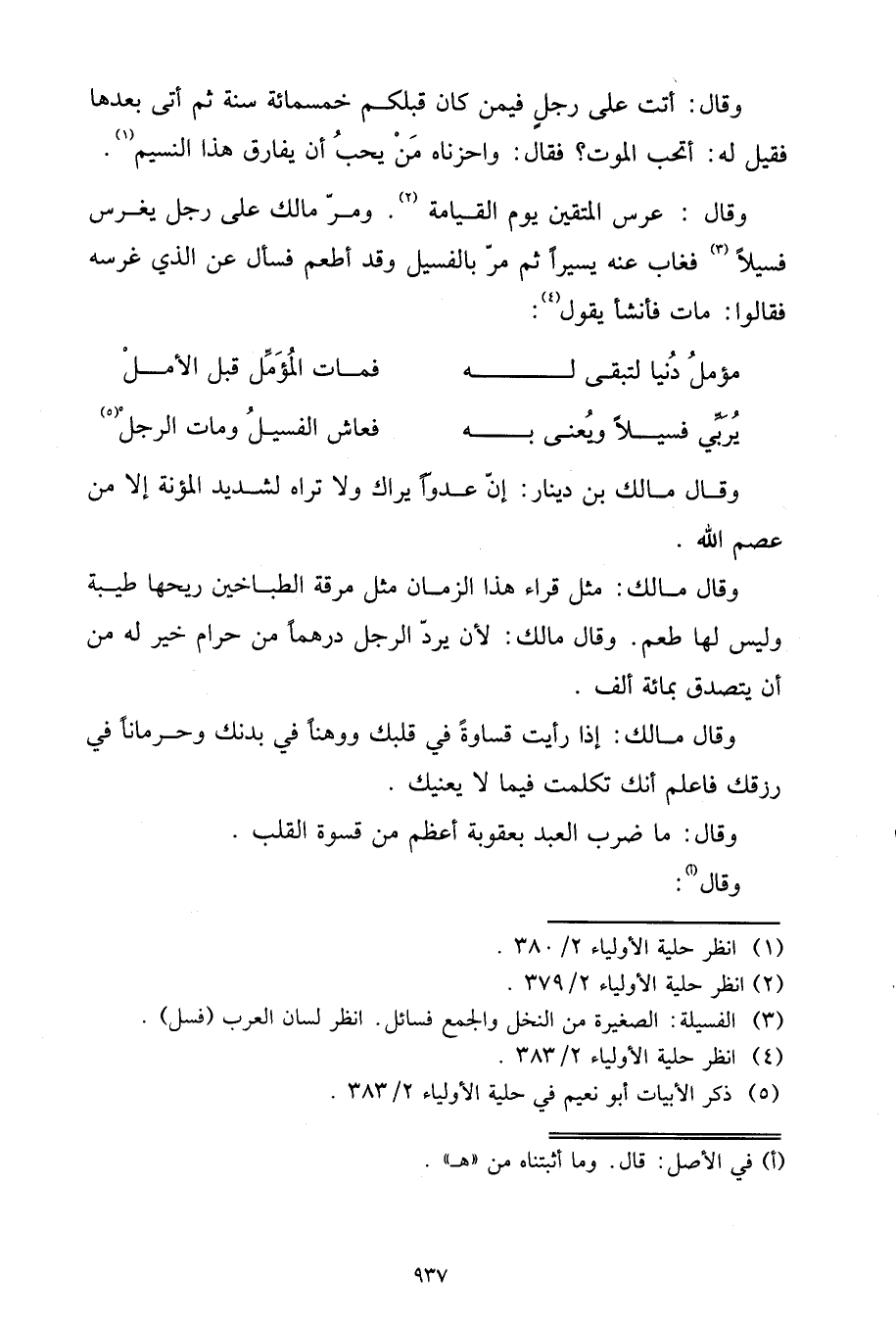 وَقَالَ مَالِكٌ: إِذَا رَأَيْتَ قَسَاوَةً فِي قَلْبِكَ وَوَهَنًا فِي بَدَنِكَ وَحِرْمَانًا فِي رِزْقِكَ، فَاعْلَمْ أَنَّكَ تَكَلَّمْتَ فِيمَا لَا يَعْنِيكَ.