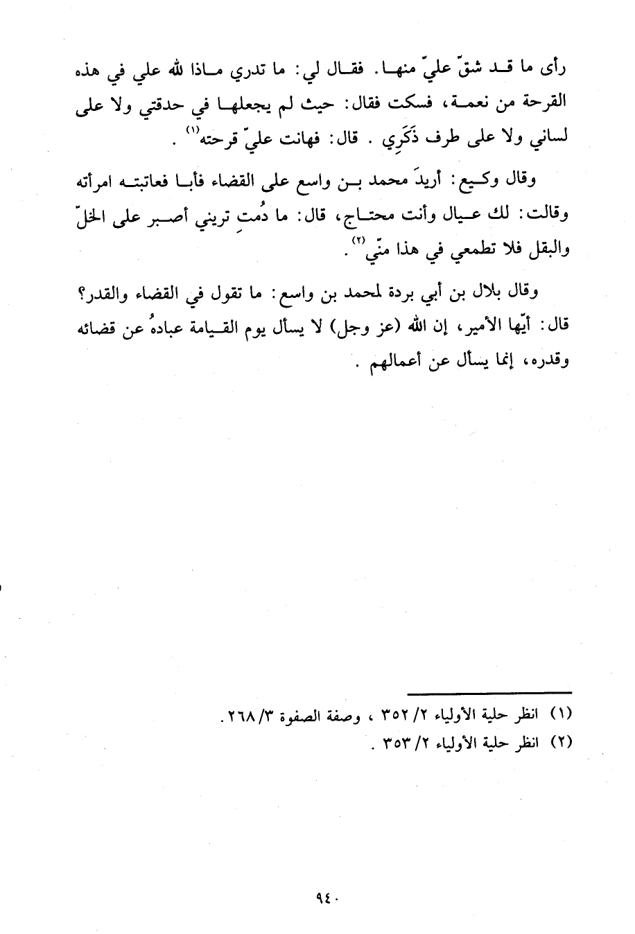 وَقَالَ بِلَالُ بْنُ أَبِي بَرْدَةَ لِمُحَمَّدِ بْنِ وَاسِعٍ: مَا تَقُولُ فِي الْقَضَاءِ وَالْقَدَرِ؟ قَالَ: أَيُّهَا الْأَمِيرُ إِنَّ اللَّهَ عَزَّ وَجَلّ لَا يَسْأَلُ يَوْمَ الْقِيَامَةِ عِبَادَهُ عَنْ قَضَاءِهِ وَقَدَرِهِ، إنما يسأل عَنْ أَعْمَالِهِمْ.