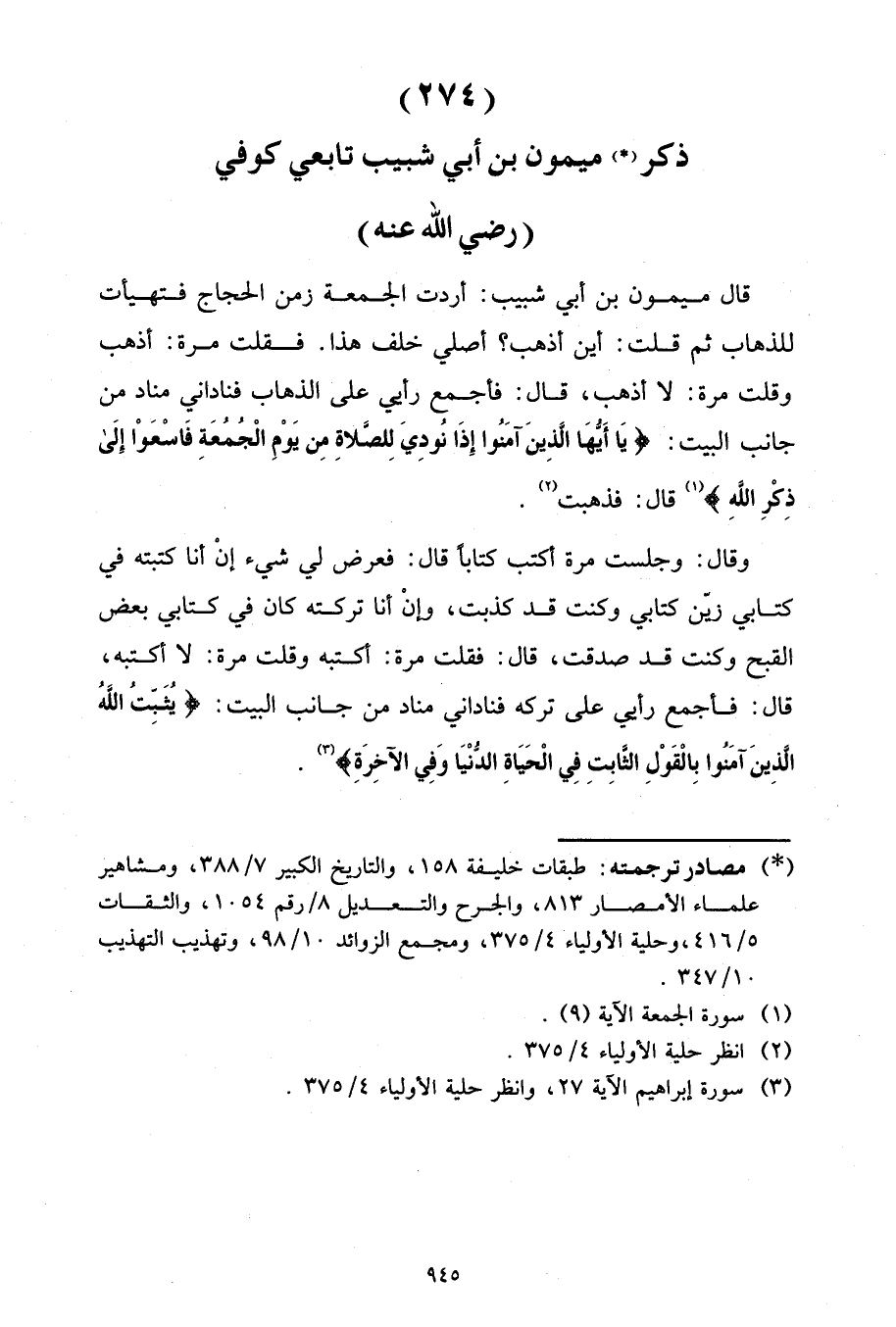 فَقُلْتُ مَرَّةً: أَذْهَبُ، وَقُلْتُ مَرَّةً لَا أَذْهَبُ، قَالَ: فَأُجْمِعَ رَأْيِي عَلَى الذَّهَابِ فَنَادَانِي مُنَادٍ مِنْ جَانِبِ الْبَيْتِ: {يَأَيُّهَا الَّذِينَ آمَنُوا إِذَا نُودِيَ لِلصَّلاةِ مِنْ يَوْمِ الْجُمُعَةِ فَاسْعَوْا إِلَى ذِكْرِ اللَّهِ} [الجمعة: ٩] .