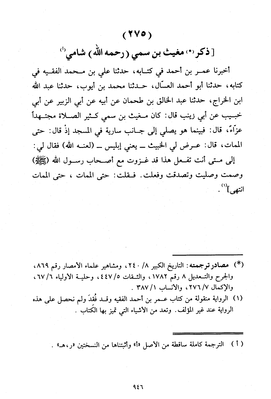 أَخْبَرَنَا عُمَرُ بْنُ أَحْمَدَ، فِي كِتَابِهِ، حَدَّثَنَا عَلِيُّ بْنُ مُحَمَّدٍ الْفَقِيهُ، فِي كِتَابِهِ، حَدَّثَنَا أَبُو أَحْمَدَ الْعَسَّالُ، حَدَّثَنَا مُحَمَّدُ بْنُ أَيُّوبَ، حَدَّثَنَا عَبْدُ اللَّهِ بْنُ الْخَرَاجِ، حَدَّثَنَا عَبْدُ الْخَالِقِ بْنِ طَحْمَانَ، عَنْ أَبِيهِ، عَنْ أَبِي الزُّبَيْرِ، عَنْ أَبِي خَبِيبٍ، عَنْ أَبِي زَيْنَبَ , قَالَ: " كَانَ مُغِيثُ بْنُ سُمَيٍّ كَثِيرَ الصَّلَاةِ، مُجْتَهِدًا، عَزَّاءً، قَالَ: فَبَيْنَمَا هُوَ يُصَلِّي إِلَى جَانِبِ سَارِيَةٍ فِي الْمَسْجِدِ إِذْ قَالَ: حَتَّى الْمَمَاتِ، قَالَ: عَرَضَ لِيَ الْخَبِيثَ، يَعْنِي إِبْلِيسُ لعَنَهُ اللَّهُ، فَقَالَ لِي: إِلَى مَتَى أَنْتَ تَفْعَلُ هَذَا؟ قَدْ غَزَوْتَ مَعَ أَصْحَابِ رَسُولِ اللَّهِ صَلَّى اللَّهُ عَلَيْهِ وَسَلَّمَ، وَصُمْتُ وَصَلَّيْتُ، وَتَصَدَّقْتُ، وَفَعَلْتُ.