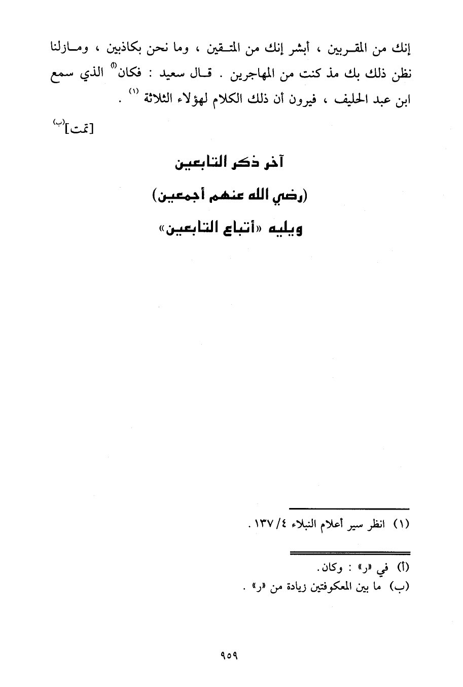 تَمَّتْ آخِرُ ذِكْرِ التَّابِعِينَ رَضِيَ اللَّهُ عَنْهُمْ أَجْمَعِينَ، وَيَلِيهِ أَتْبَاعُ التَّابِعِينَ