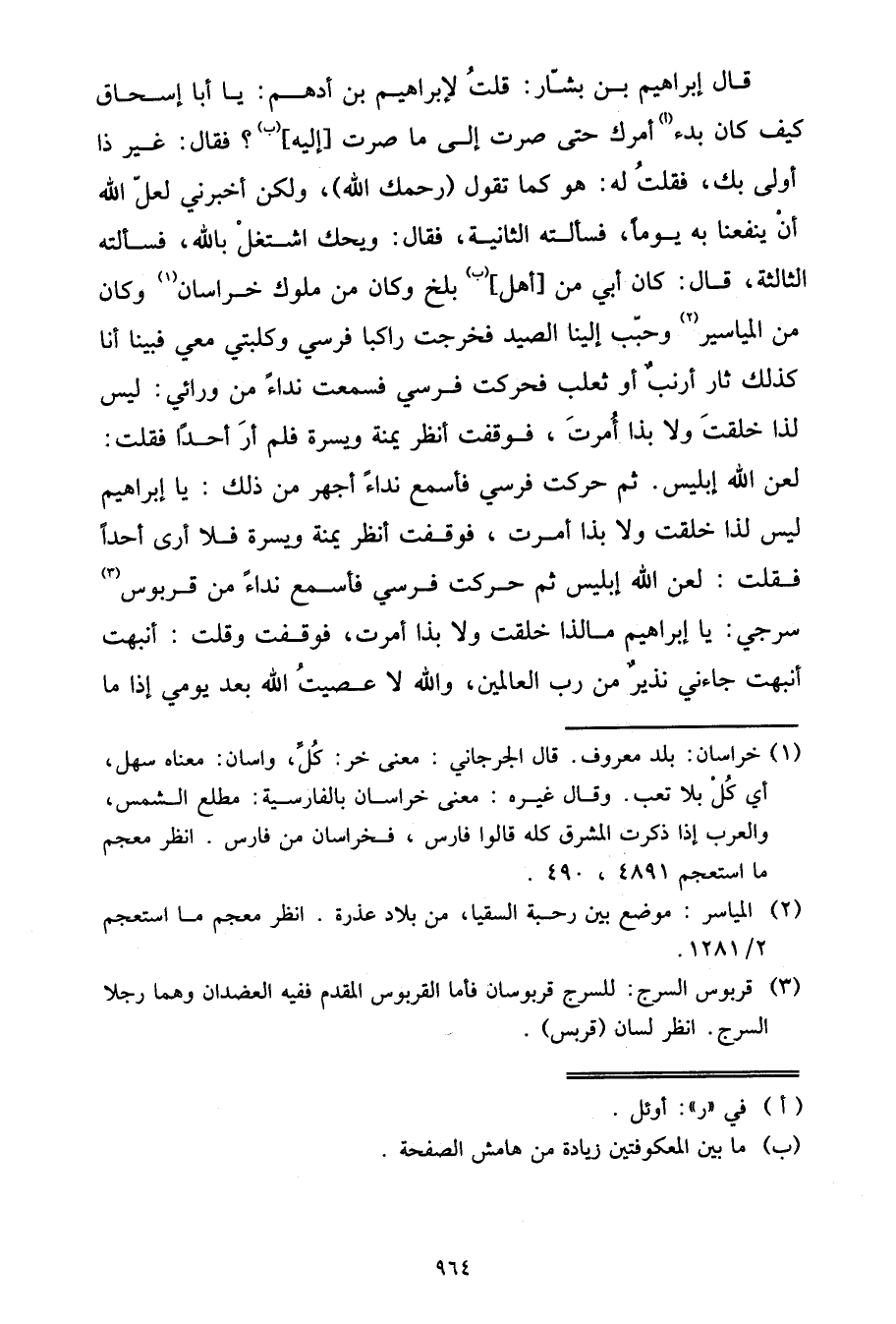 ثُمَّ حَرَّكْتُ فَرَسِي فَأَسْمَعُ نِدَاءً أَجْهَرُ مِنْ ذَلِكَ: يَا إِبْرَاهِيمُ لَيْسَ لِذَا خُلِقْتَ وَلَا بِذَا أُمرْتَ، فَوَقَفْتُ أَنْظُرُ يُمْنَةً وَيُسْرَةً فَلَا أَرَى أَحَدًا فَقُلْتُ: لَعَنَ اللَّهُ إِبْلِيسَ، ثُمَّ حَرَّكْتُ فَرَسِي فَأَسْمَعُ نِدَاءً مِنْ قُرْبُوسِ سَرْجِي: يَا إِبْرَاهِيمُ مَا لِذَا خُلِقْتَ وَلَا بِذَا أُمِرْتَ، فَوَقَفْتُ وَقُلْتُ: أُنْبِهْتُ أُنْبِهْتُ، جَاءَنِي نَذِيرٌ مِنْ رَبِّ الْعَالَمِينَ، وَاللَّهِ لَا عَصَيْتُ اللَّهَ بَعْدَ يَوْمِي إِذَا مَا