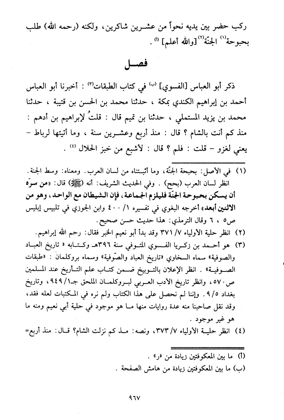 ذِكْرُ أَبُو الْعَبَّاسِ الْفَسَوِيِّ فِي كِتَابِ الطَّبَقَاتِ، أَخْبَرَنَا أَبُو الْعَبَّاسِ أَحْمَدُ بْنُ إِبْرَاهِيمَ الْكِنْدِيُّ بِمَكَّةَ، حَدَّثَنَا مُحَمَّدُ بْنُ الْحَسَنِ بْنِ قُتَيْبَةَ، حَدَّثَنَا مُحَمَّدُ بْنُ يَزِيدَ الْمُسْتَمْلِي، حَدَّثَنَا ابْنُ تَمِيمٍ , قَالَ " قُلْتُ لِإِبْرَاهِيمَ بْنِ أَدْهَمَ: مُنْذُ كَمْ أَنْتَ بِالشَّامِ؟ قَالَ: مُنْذُ أَرْبَعٍ وَعِشْرِينَ سَنَةً، وَمَا أَتَيْتُهَا لِرِبَاطٍ، يَعْنِي الْغَزْوَ، قُلْتُ: فَلِمَ، قَالَ: لِأَشْبَعَ مِنْ خُبْزِ الْحَلَالِ
