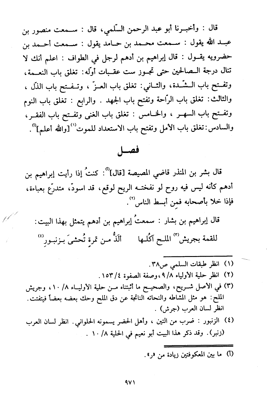 قَالَ: وَأَخْبَرَنَا أَبُو عَبْدِ الرَّحْمَنِ السَّلَمِيُّ , قَالَ: سَمِعْتُ مَنْصُورَ بْنَ عَبْدِ اللَّهِ , يَقُولُ: سَمِعْتُ مُحَمَّدَ بْنَ حَامِدٍ , يَقُولُ: سَمِعْتُ أَحْمَدَ بْنَ حَضْرَوِيهِ , يَقُولُ: قَالَ إِبْرَاهِيمُ بْنُ أَدْهَمَ لِرَجُلٍ فِي الطَّوَافِ: " اعْلَمْ أَنَّكَ لَا تَنَالُ دَرَجَةَ الصَّالِحِينَ حَتَّى تَجُوزَ سَتَّ عَقَبَاتٍ أَوَّلُهُ: تُغْلِقُ بَابَ النِّعْمَةِ، وَتَفْتَحُ بَابَ الشِّدَّةِ، وَالثَّانِي: تُغْلِقُ بَابَ الْعِزِّ , وَتَفْتَحُ بَابَ الذُّلِّ، وَالثَّالِثُ تُغْلِقُ بَابَ الرَّاحَةِ , وَتَفْتَحُ بَابَ الْجَهْدِ، وَالرَّابِعُ تُغْلِقُ بَابَ النَّوْمِ , وَتَفْتَحُ بَابَ السَّهَرِ، وَالْخَامِسُ: تُغْلِقُ بَابَ الْغِنَى , وَتَفْتَحُ بَابَ الْفَقْرِ، وَالسَّادِسُ: تُغْلِقُ بَابَ الْأَمَلِ , وَتَفْتَحُ بَابَ الِاسْتِعْدَادِ لِلْمَوْتِ ".