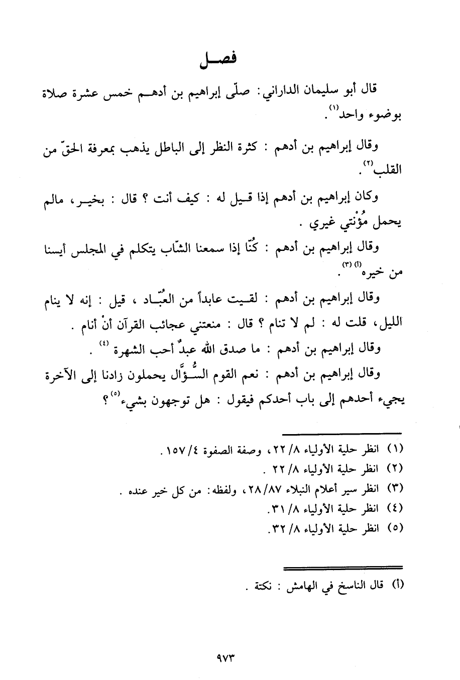 قَالَ أَبُو سُلَيْمَانَ الدَّارَانِيُّ: صَلَّى إِبْرَاهِيمُ بْنُ أَدْهَمَ خَمْسَ عَشْرَةَ صَلَاةً بِوُضُوءٍ وَاحِدٍ.