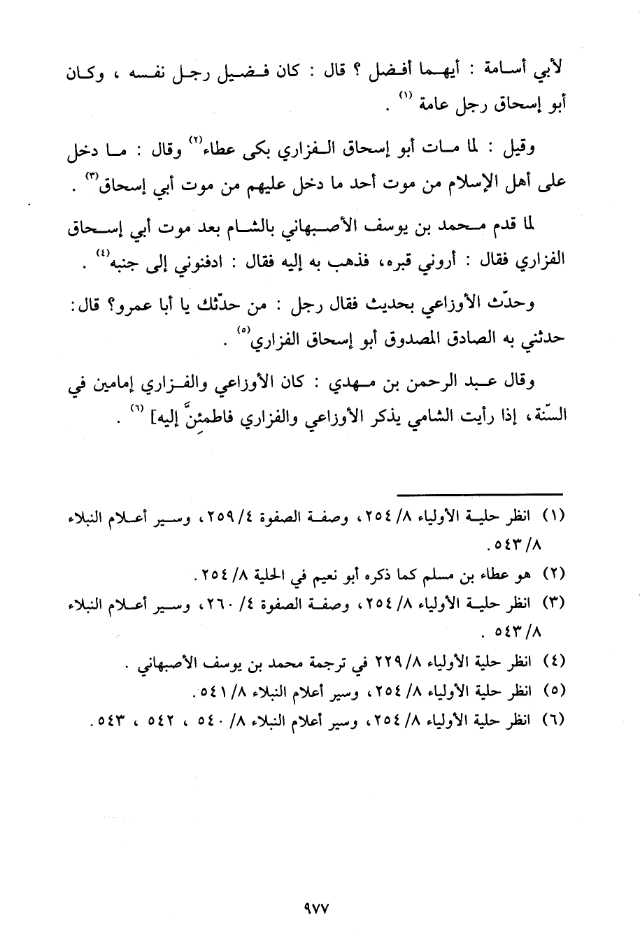 وَحَدَّثَ الْأَوْزَاعِيُّ بِحَدِيثٍ فقَالَ رَجُلٌ: مَنْ حَدَّثَكَ يَا أَبَا عَمْرٍو؟ قَالَ: إِبْرَاهِيمُ بِهِ الصَّادِقُ الْمَصْدُوقُ أَبُو إِسْحَاقَ الْفَزَارِيُّ وَقَالَ عَبْدُ الرَّحْمَنِ بْنُ مَهْدِيٍّ: كَانَ الْأَوْزَاعِيُّ , وَالْفَزَارِيُّ , إِمَامَيْنِ فِي السُّنَّةِ، إِذَا رَأَيْتَ الشَّامِيَّ , يَذْكُرُ الْأَوْزَاعِيَّ , وَالْفَزَارِيَّ , فَاطْمَئِنَّ إِلَيْهِ.