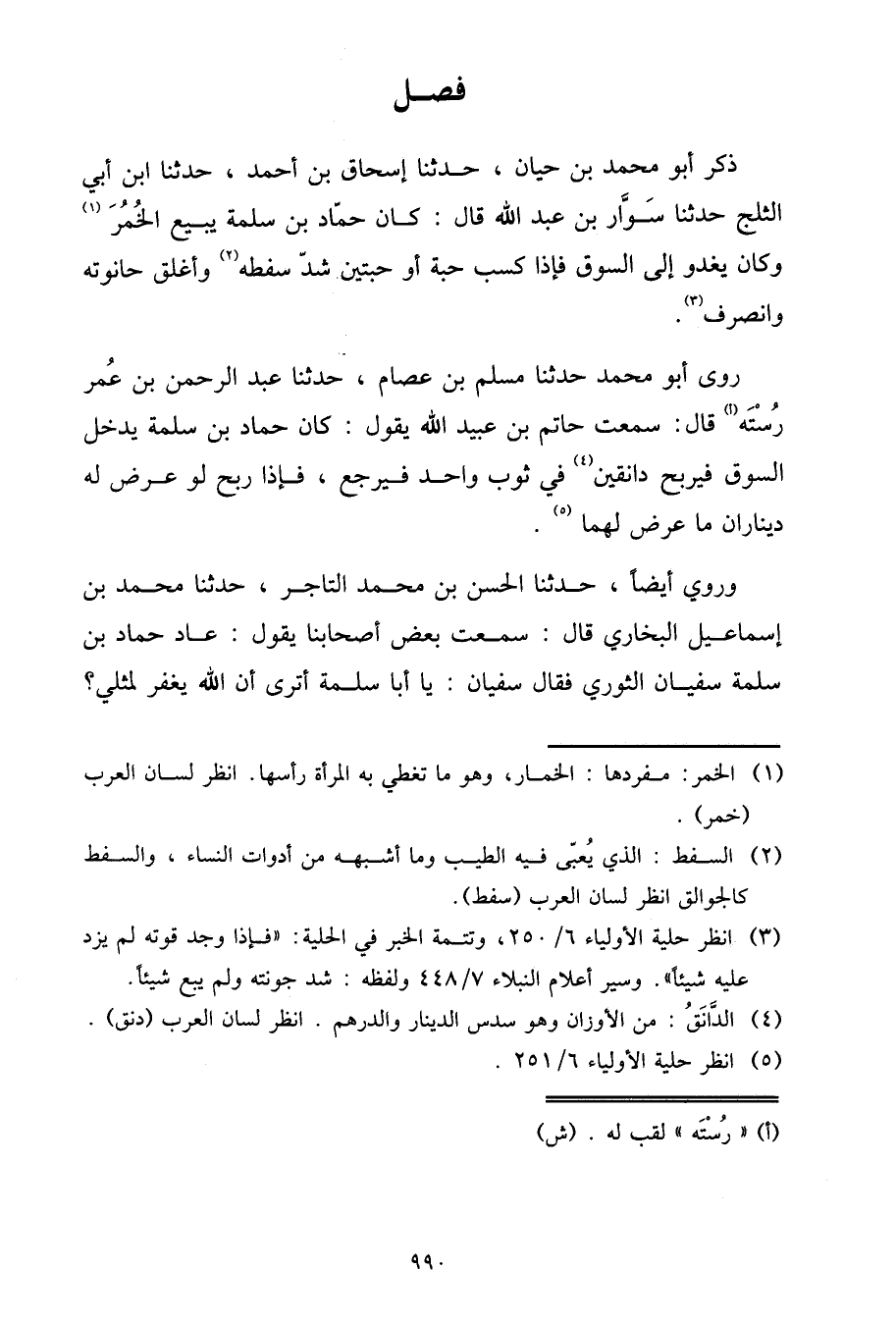 ذِكْرُ أَبُو مُحَمَّدِ بْنِ حَيَّانٍ حَدَّثَنَا إِسْحَاقُ بْنُ أَحْمَدَ، حَدَّثَنَا ابْنُ أَبِي الثَّلْجِ، حَدَّثَنَا سَوَّارُ بْنُ عَبْدِ اللَّهِ , قَالَ: كَانَ حَمَّادُ بْنُ سَلَمَةَ يَبِيعُ الْخَمْرَ وَكَانَ يَغْدُو إِلَى السُّوقِ، فَإِذَا كَسَبَ حَبَّةٌ أَوْ حَبَّتَيْنِ شَدَّ سَفَطَهُ وَأَغْلَقَ حَانُوتَهُ وَانْصَرَفَ.