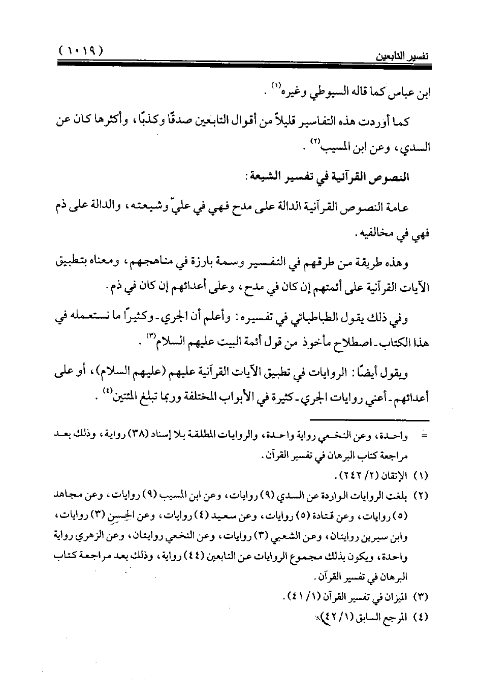 (¬2) بلغت الروايات الواردة عن السدي (9) روايات، وعن ابن المسيب (9) روايات، وعن مجاهد (5) روايات، وعن قتادة (5) روايات، وعن سعيد (4) روايات، وعن الحسن (3) روايات، وابن سيرين روايتان، وعن الشعبي (3) روايات، وعن النخعي روايتان، وعن الزهري رواية واحدة، ويكون بذلك مجموع الروايات عن التابعين (44) رواية، وذلك بعد مراجعة كتاب البرهان في تفسير القرآن.