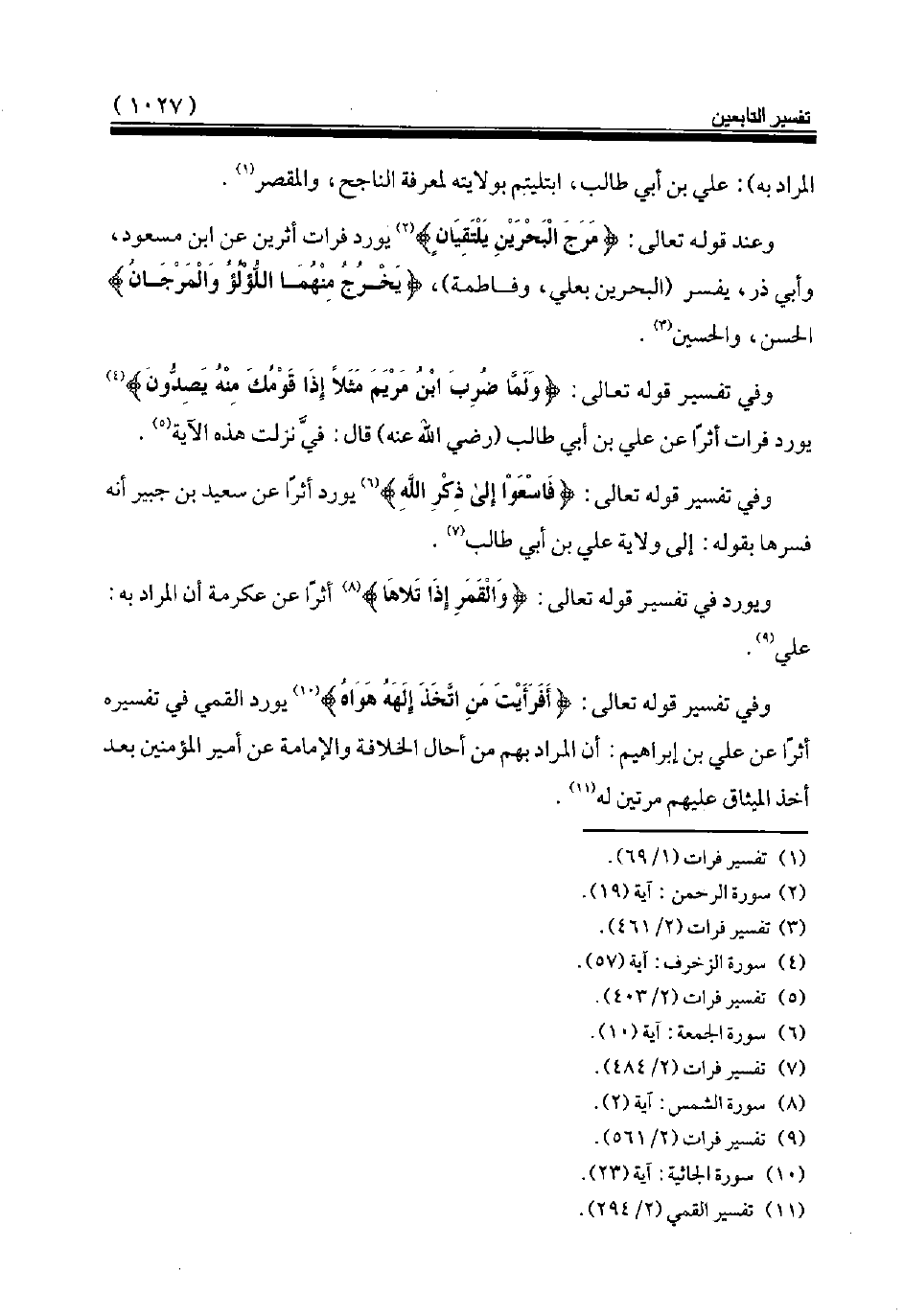وفي تفسير قوله تعالى: {فَاسْعَوْا إِلى َ ذِكْرِ اللَّهِ} (¬6) يورد أثرا عن سعيد بن جبير أنه فسرها بقوله: إلى ولاية علي بن أبي طالب (¬7).