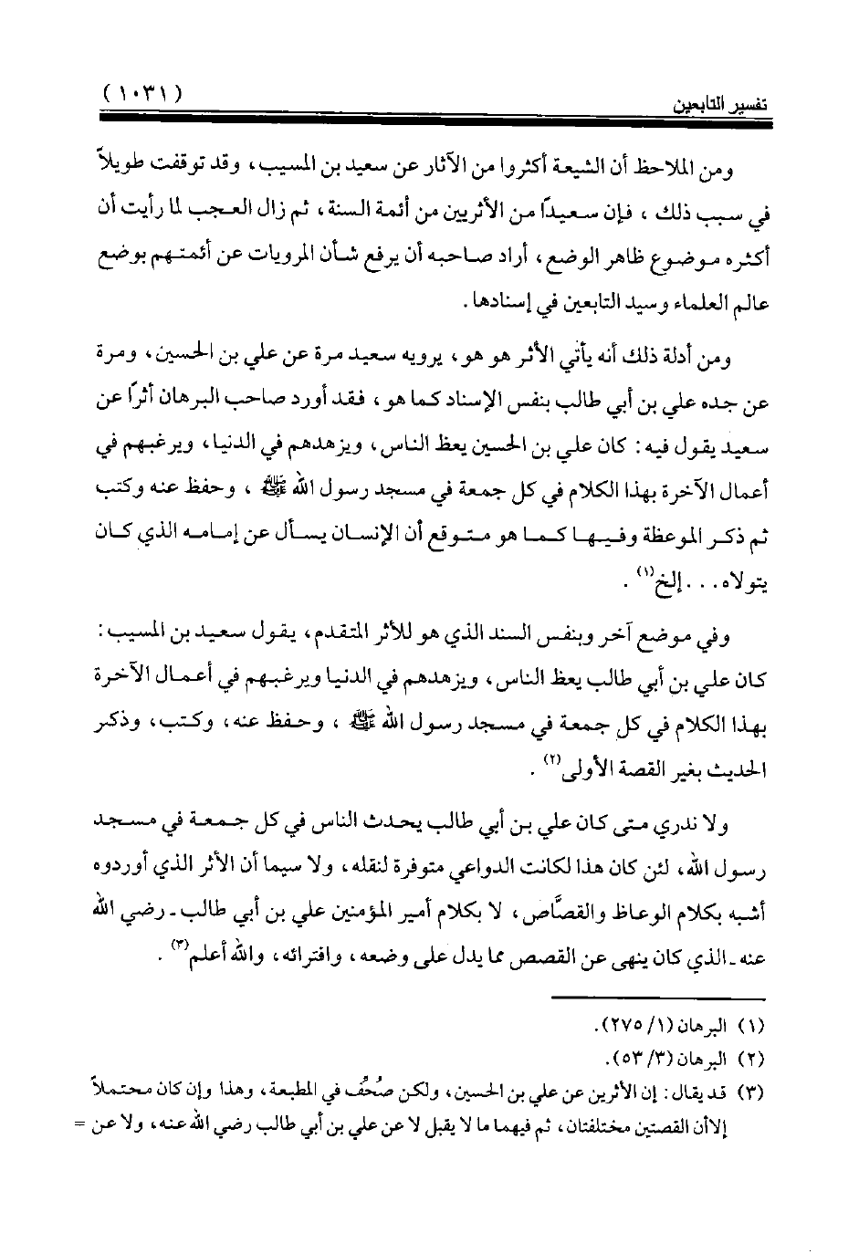 ومن أدلة ذلك أنه يأتي الأثر هو هو، يرويه سعيد مرة عن علي بن الحسين، ومرة عن جده علي بن أبي طالب بنفس الإسناد كما هو، فقد أورد صاحب البرهان أثرا عن سعيد يقول فيه: كان علي بن الحسين يعظ الناس، ويزهدهم في الدنيا، ويرغبهم في أعمال الآخرة بهذا الكلام في كل جمعة في مسجد رسول الله صلى الله عليه وسلم، وحفظ عنه وكتب ثم ذكر الموعظة وفيها كما هو متوقع أن الإنسان يسأل عن إمامه الذي كان يتولاه إلخ (¬1).